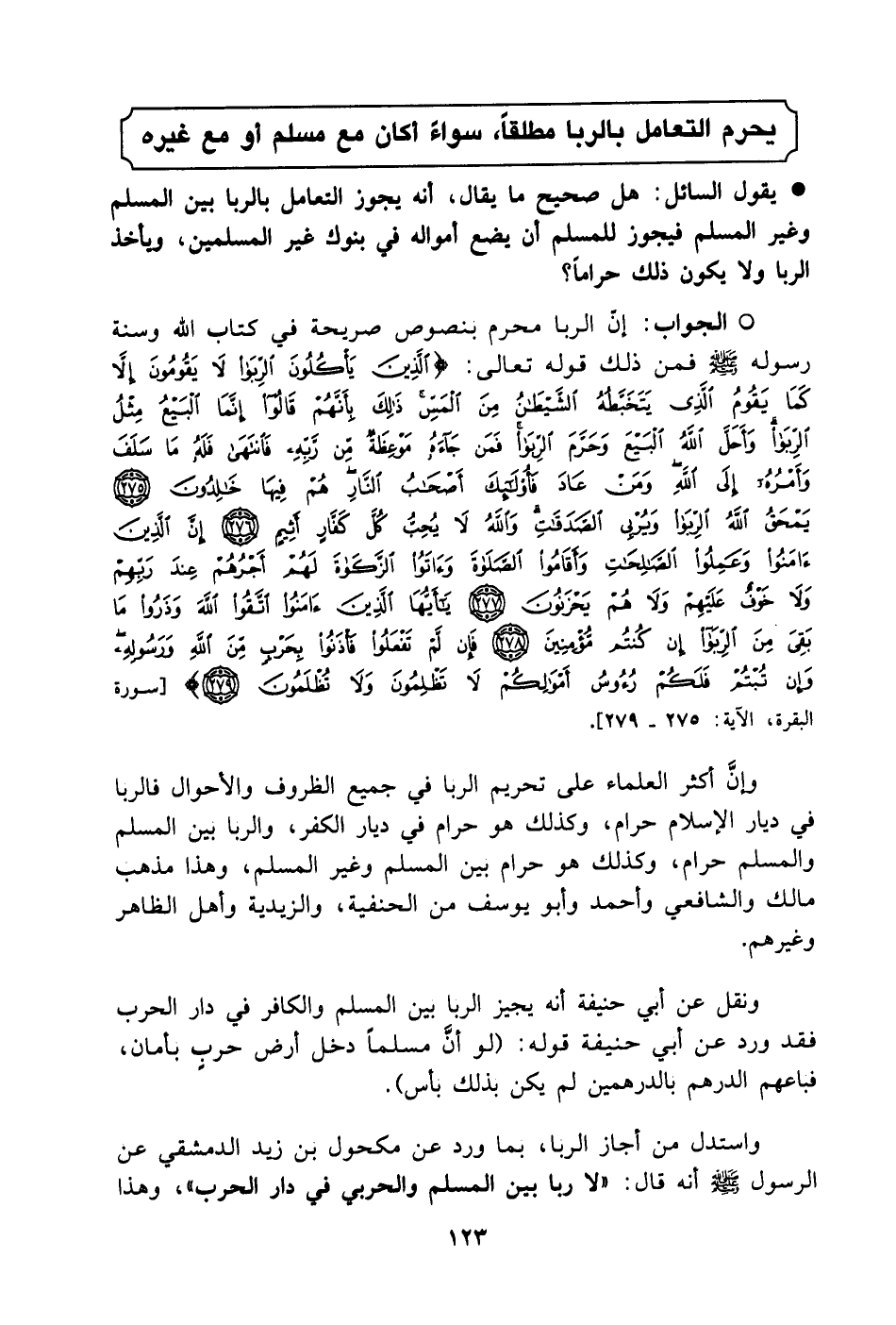 وإنَّ أكثر العلماء على تحريم الربا في جميع الظروف والأحوال فالربا في ديار الإسلام حرام، وكذلك هو حرام في ديار الكفر، والربا بين المسلم والمسلم حرام، وكذلك هو حرام بين المسلم وغير المسلم، وهذا مذهب مالك والشافعي وأحمد وأبو يوسف من الحنفية، والزيدية وأهل الظاهر وغيرهم.