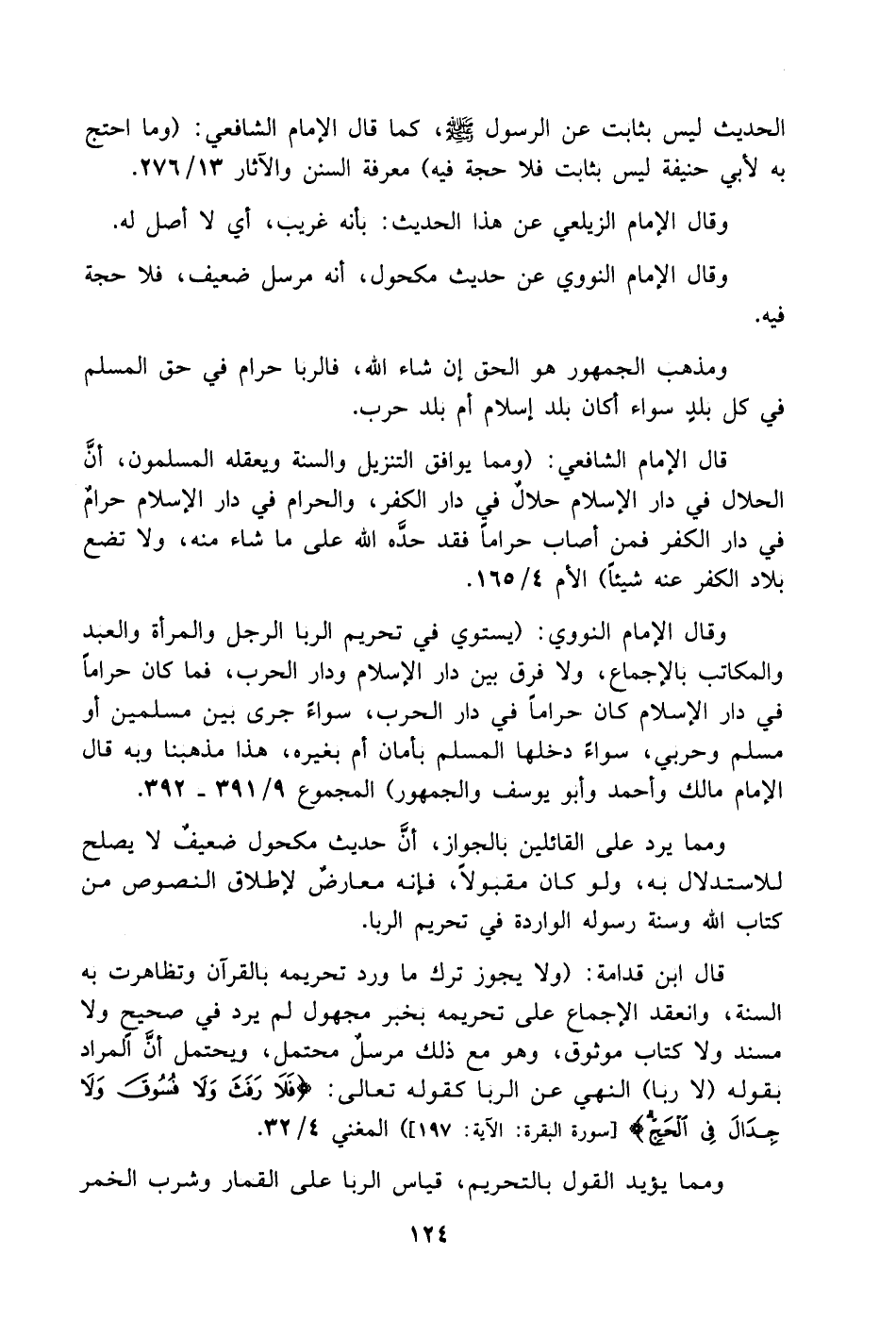 ومذهب الجمهور هو الحق إن شاء الله، فالربا حرام في حق المسلم في كل بلدٍ سواء أكان بلد إسلام أم بلد حرب.