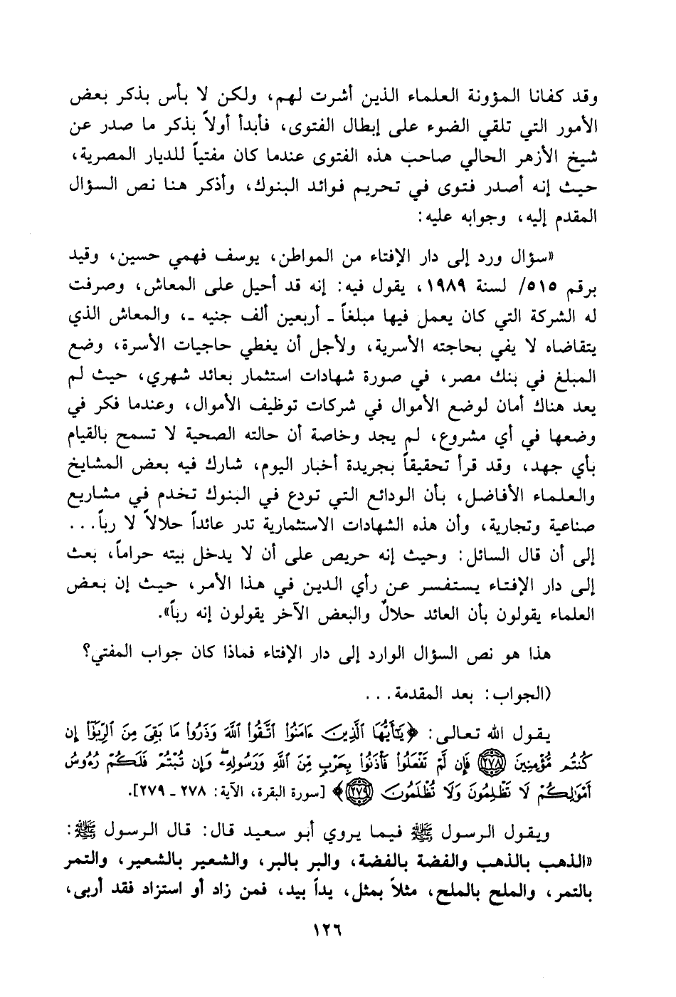 ((سؤال ورد إلى دار الإفتاء من المواطن، يوسف فهمي حسين، وقيد برقم 515/ لسنة 1989، يقول فيه: إنه قد أحيل على المعاش، وصرفت له الشركة التي كان يعمل فيها مبلغاً - أربعين ألف جنيه -، والمعاش الذي يتقاضاه لا يفي بحاجته الأسرية، ولأجل أن يغطي حاجيات الأسرة، وضع المبلغ في بنك مصر، في صورة شهادات استثمار بعائد شهري، حيث لم يعد هناك أمان لوضع الأموال في شركات توظيف الأموال، وعندما فكر في وضعها في أي مشروع، لم يجد وخاصة أن حالته الصحية لا تسمح بالقيام بأي جهد، وقد قرأ تحقيقاً بجريدة أخبار اليوم، شارك فيه بعض المشايخ والعلماء الأفاضل، بأن الودائع التي تودع في البنوك تخدم في مشاريع صناعية وتجارية، وأن هذه الشهادات الإستثمارية تدر عائداً حلالاً لا رباً .... إلى أن قال السائل: وحيث إنه حريص على أن لا يدخل بيته حراماً، بعث إلى دار الإفتاء يستفسر عن رأي الدين في هذا الأمر، حيث إن بعض العلماء يقولون بأن العائد حلالٌ والبعض الآخر يقولون إنه رباً)).