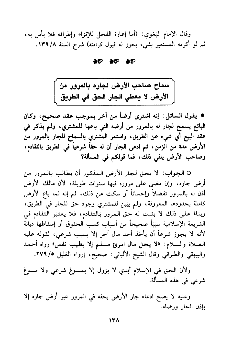الجواب: لا يحق لجار الأرض المذكور أن يطالب بالمرور من أرض جاره، وإن مضى على مروره فيها سنوات طويلة، لأن مالك الأرض أذن له بالمرور تفضلاً وإحساناً أو سكت عن ذلك، ثم إنه لما باع الأرض كاملة بحدودها المعروفة، ولم يبين للمشتري وجود حق للجار في الطريق، وبناءً على ذلك لا يثبت له حق المرور بالتقادم، فلا يعتبر التقادم في الشريعة الإسلامية سبباً صحيحاً من أسباب كسب الحقوق أو إسقاطها ديانة لأنه لا يجوز شرعاً أن يأخذ أحد مال آخر إلا بسبب شرعي، لقوله عليه الصلاة والسلام: (لا يحل مال امرئ مسلم إلا بطيب نفس) رواه أحمد والبيهقي والطبراني وقال الشيخ الألباني: صحيح، إرواء الغليل 5/ 279.