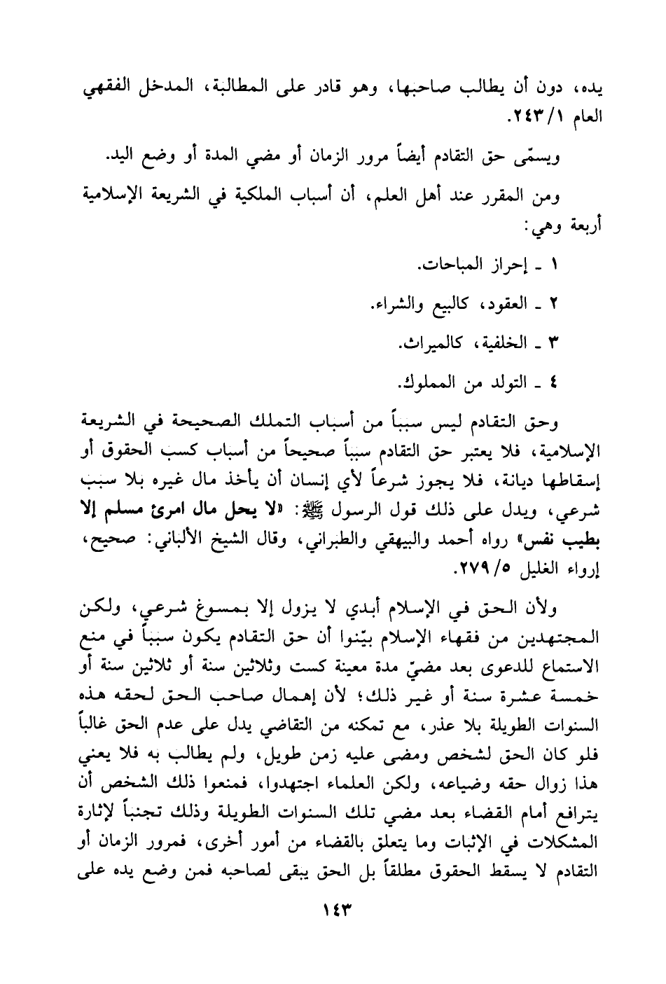 ولأن الحق في الإسلام أبدي لا يزول إلا بمسوغ شرعي، ولكن المجتهدين من فقهاء الإسلام بيّنوا أن حق التقادم يكون سبباً في منع الاستماع للدعوى بعد مضيّ مدة معينة كست وثلاثين سنة أو ثلاثين سنة أو خمسة عشرة سنة أو غير ذلك، لأن إهمال صاحب الحق لحقه هذه السنوات الطويلة بلا عذر، مع تمكنه من التقاضي يدل على عدم الحق غالباً فلو كان الحق لشخص ومضى عليه زمن طويل، ولم يطالب به فلا يعني هذا زوال حقه وضياعه، ولكن العلماء اجتهدوا، فمنعوا ذلك الشخص أن يترافع أمام القضاء بعد مضي تلك السنوات الطويلة وذلك تجنباً لإثارة المشكلات في الإثبات وما يتعلق بالقضاء من أمور أخرى، فمرور الزمان أو التقادم لا يسقط الحقوق مطلقاً بل الحق يبقى لصاحبه فمن وضع يده على