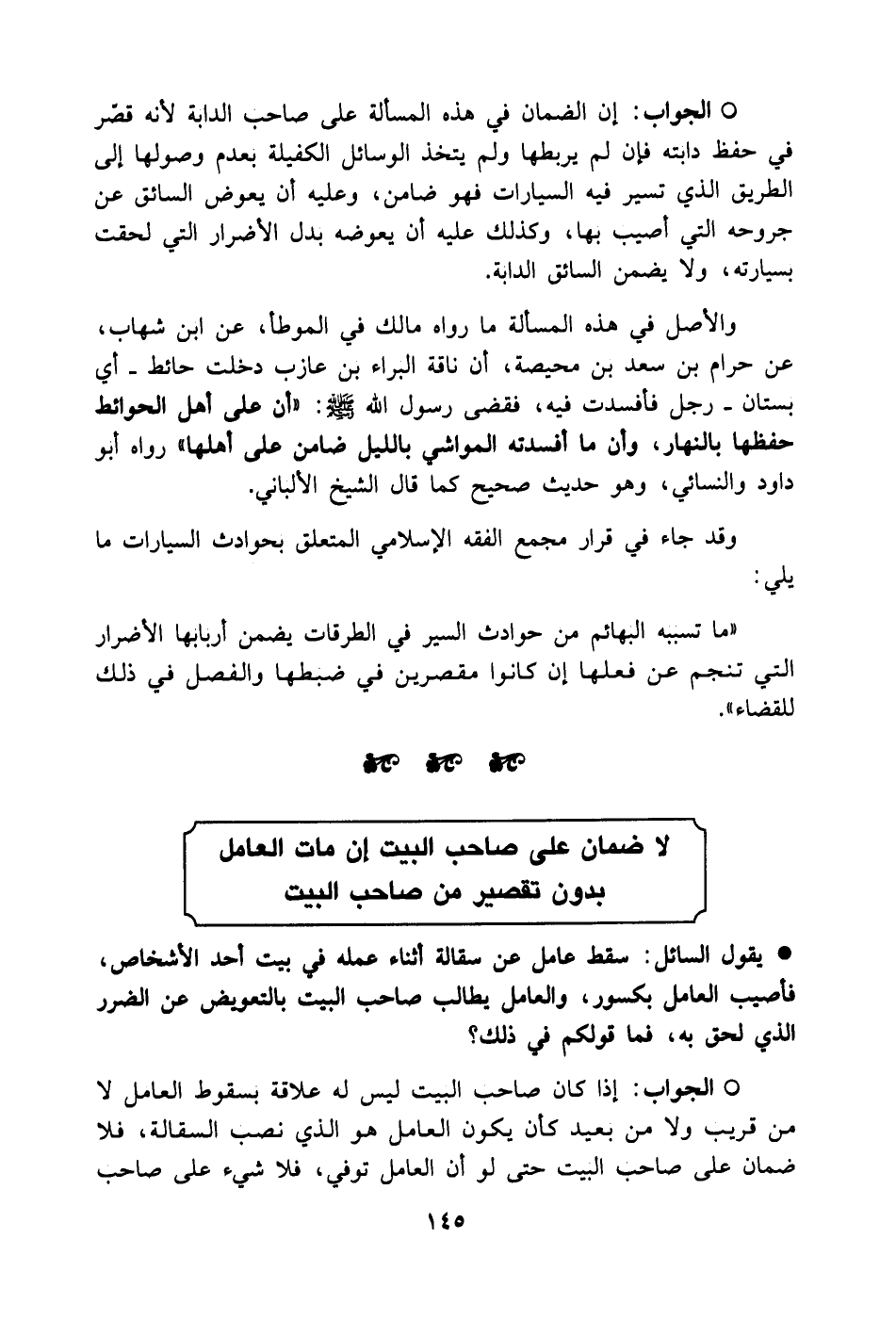 ((ما تسببه البهائم من حوادث السير في الطرقات يضمن أربابها الأضرار التي تنجم عن فعلها إن كانوا مقصرين في ضبطها والفصل في ذلك للقضاء)).