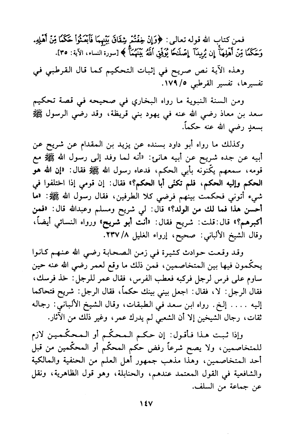 وهذه الآية نص صريح في إثبات التحكيم كما قال القرطبي في تفسيرها، تفسير القرطبي 5/ 179.