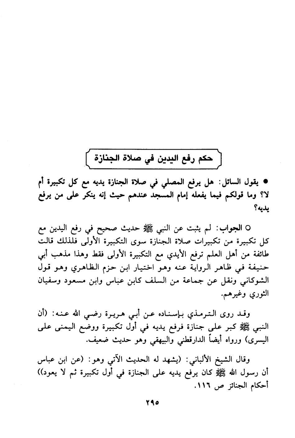 وقال الشيخ الألباني: [يشهد له الحديث الآتي وهو: (عن ابن عباس أن رسول الله - صلى الله عليه وسلم - كان يرفع يديه على الجنازة في أول تكبيرة ثم لا يعود)] أحكام الجنائز
