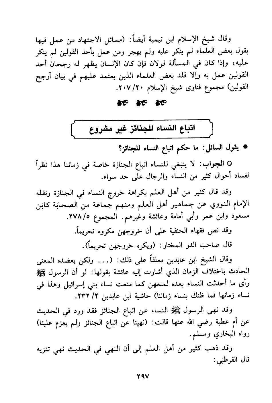 الجواب: لا ينبغي للنساء اتباع الجنازة خاصة في زماننا هذا نظراً لفساد أحوال كثير من النساء والرجال على حد سواء.