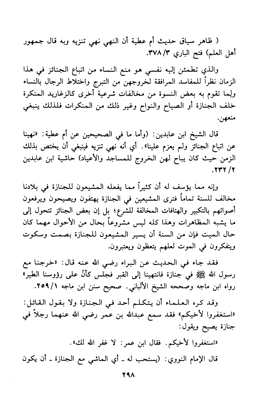 قال الشيخ ابن عابدين: [وأما ما في الصحيحين عن أم عطية: (نهينا عن اتباع الجنائز ولم يعزم علينا). أي أنه نهي تنزيه فينبغي أن يختص بذلك الزمن حيث كان يباح لهن الخروج للمساجد والأعياد] حاشية ابن عابدين 2/ 232.