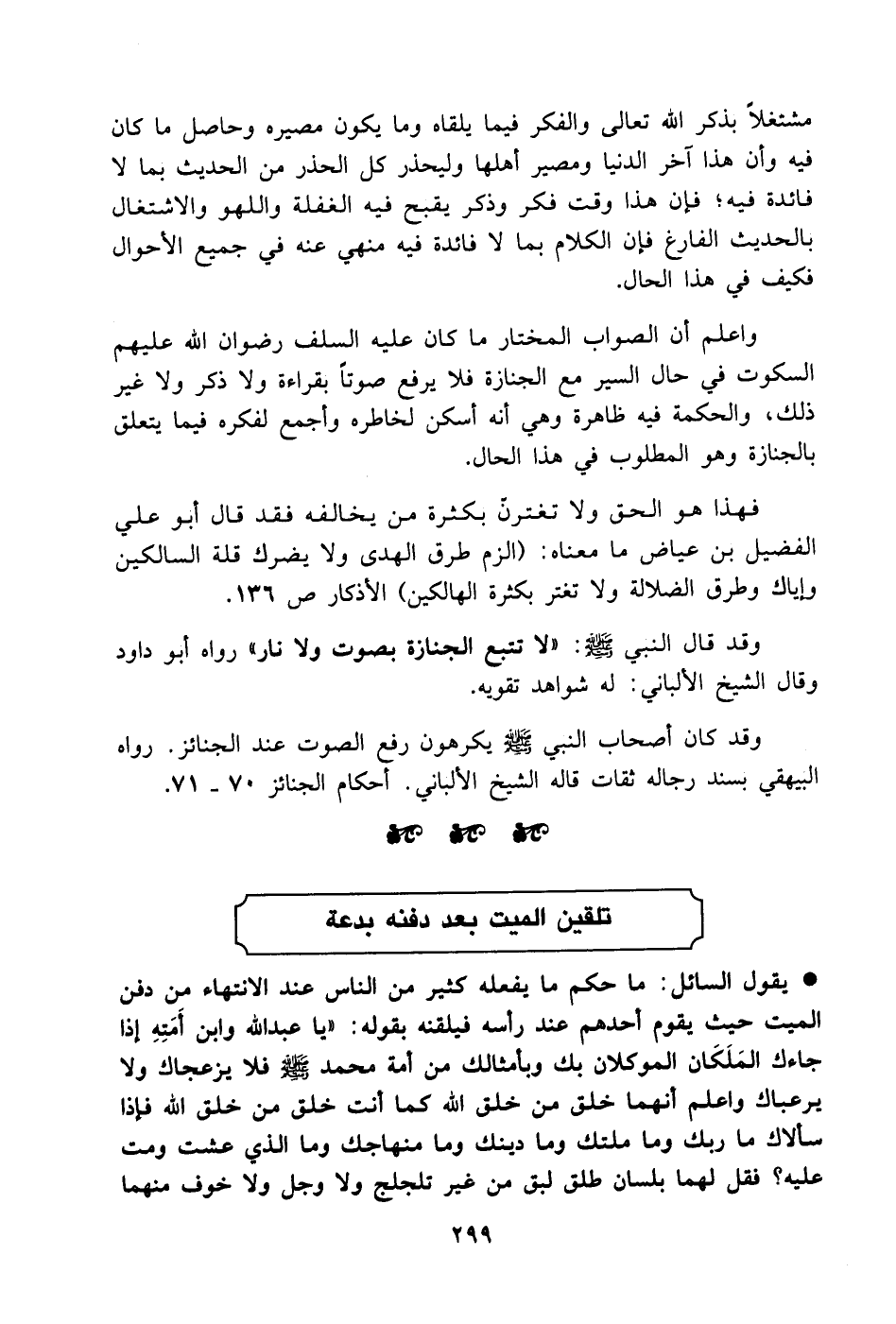 واعلم أن الصواب المختار ما كان عليه السلف رضوان الله عليهم السكوت في حال السير مع الجنازة فلا يرفع صوتاً بقراءة ولا ذكر ولا غير ذلك والحكمة فيه ظاهرة وهي أنه أسكن لخاطره وأجمع لفكره فيما يتعلق بالجنازة وهو المطلوب في هذا الحال.
