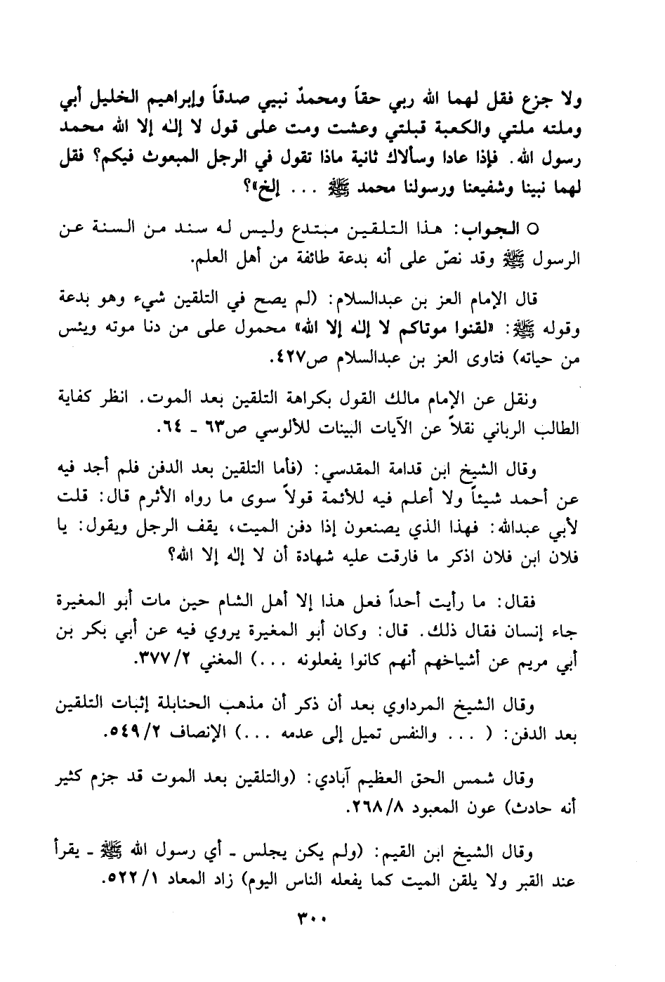 وقال الشيخ المرداوي بعد أن ذكر أن مذهب الحنابلة إثبات التلقين بعد الدفن: