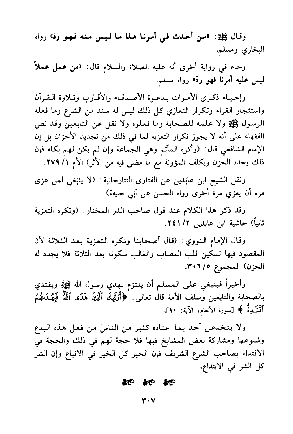 ولا ينخدعن أحد بما اعتاده كثير من الناس من فعل هذه البدع وشيوعها ومشاركة بعض المشايخ فيها فلا حجة لهم في ذلك والحجة في الاقتداء بصاحب الشرع الشريف - صلى الله عليه وسلم - فإن الخير كل الخير في الاتباع وإن الشر كل الشر في الابتداع.