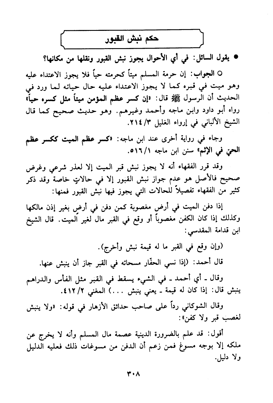 وقد قرر الفقهاء أنه لا يجوز نبش قبر الميت إلا لعذر شرعي وغرض صحيح فالأصل هو عدم جواز نبش القبور إلا في حالاتٍ خاصة وقد ذكر كثير من الفقهاء تفصيلاً للحالات التي يجوز فيها نبش القبور فمنها: