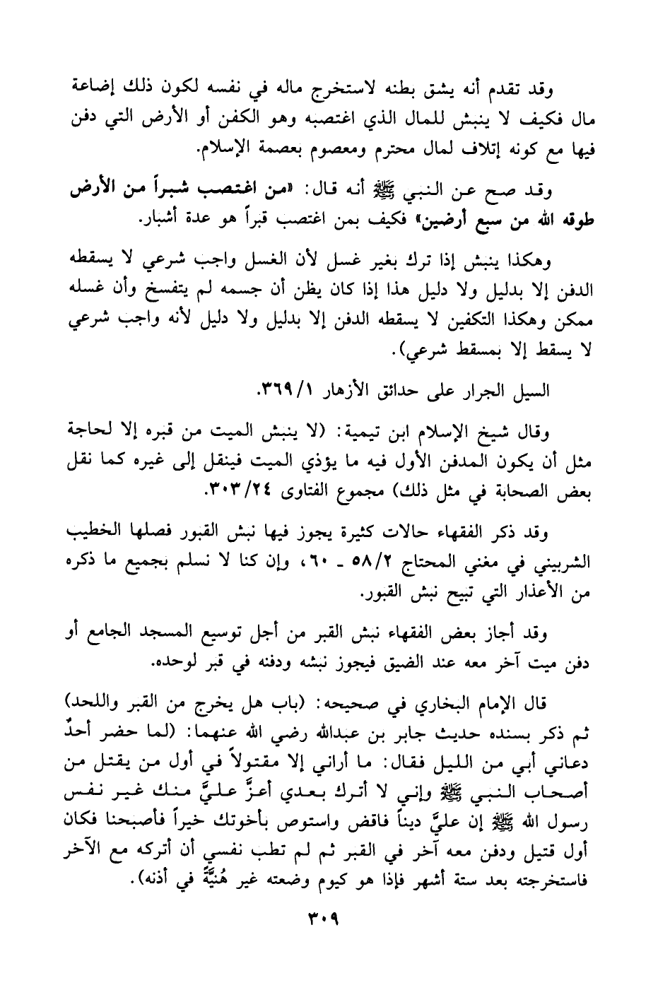وقال شيخ الإسلام ابن تيمية: [لا ينبش الميت من قبره إلا لحاجة مثل أن يكون المدفن الأول فيه ما يؤذي الميت فينقل إلى غيره كما نقل بعض الصحابة في مثل ذلك] مجموع الفتاوى 24/ 303.