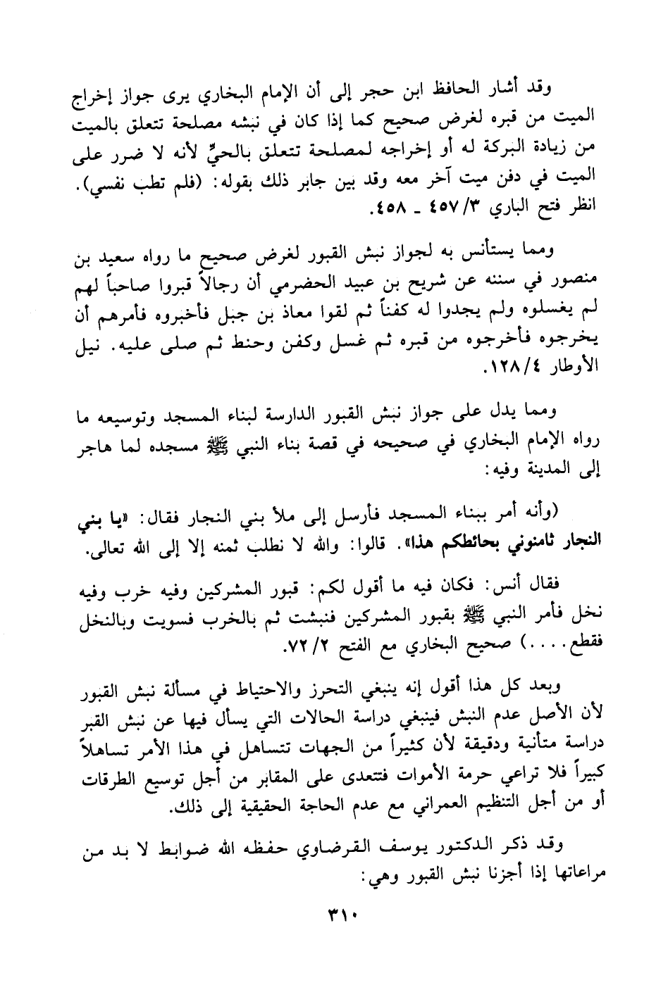 ومما يدل على جواز نبش القبور الدارسة لبناء المسجد وتوسيعه ما رواه الإمام البخاري في صحيحه في قصة بناء النبي - صلى الله عليه وسلم - مسجده لما هاجر إلى المدينة وفيه: