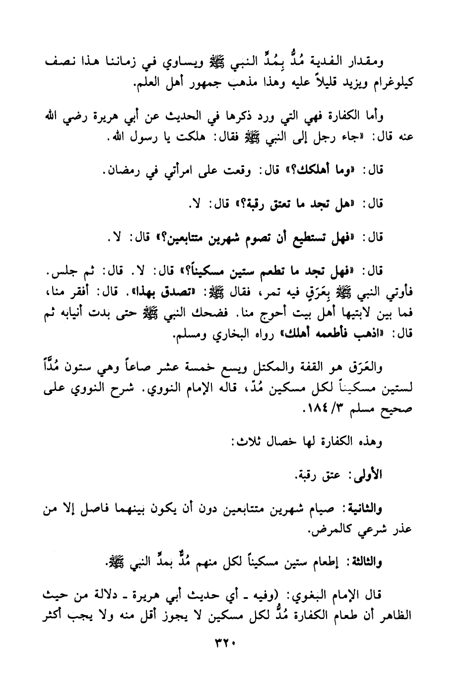 قال الإمام البغوي: [وفيه- أي حديث أبي هريرة - دلالة من حيث الظاهر أن طعام الكفارة مُدُّ لكل مسكين لا يجوز أقل منه ولا يجب أكثر
