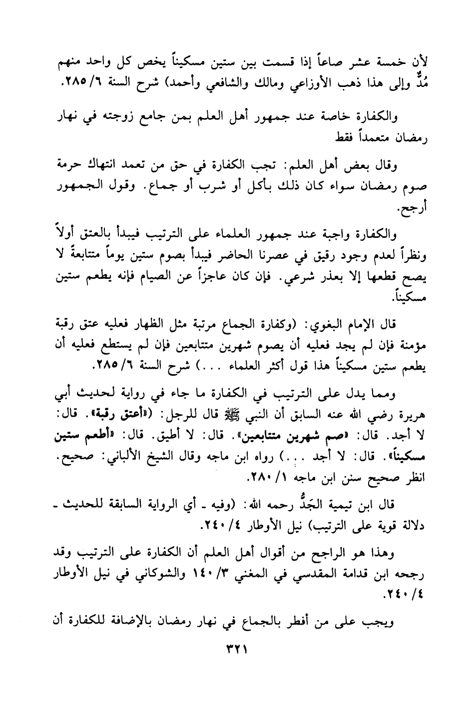 قال الإمام البغوي: [وكفارة الجماع مرتبة مثل الظهار فعليه عتق رقبة مؤمنة فإن لم يجد فعليه أن يصوم شهرين متتابعين فإن لم يستطع فعليه أن يطعم ستين مسكيناً هذا قول أكثر العلماء.] شرح السنة 6/ 285.