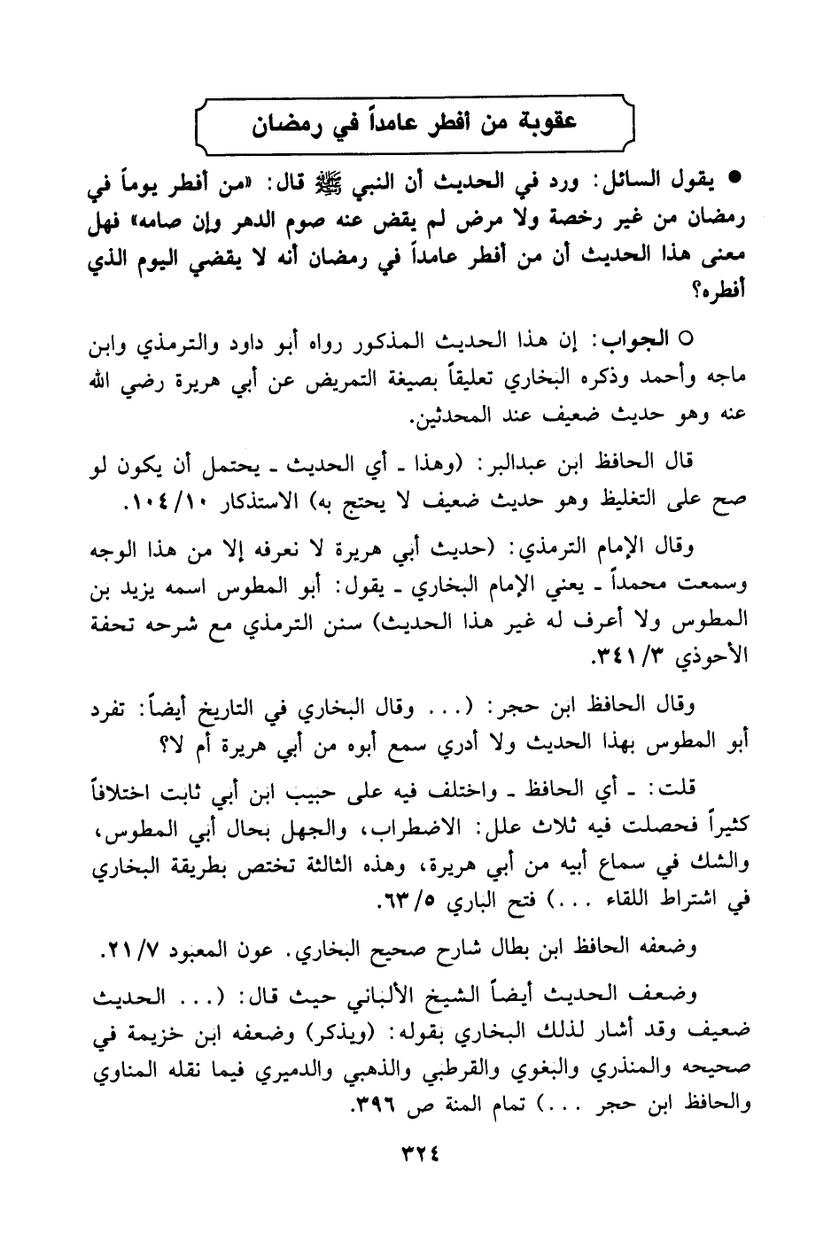الجواب: إن هذا الحديث المذكور رواه أبو داود والترمذي وابن ماجة وأحمد وذكره البخاري تعليقاً بصيغة التمريض عن أبي هريرة - رضي الله عنه - وهو حديث ضعيف عند المحدثين.