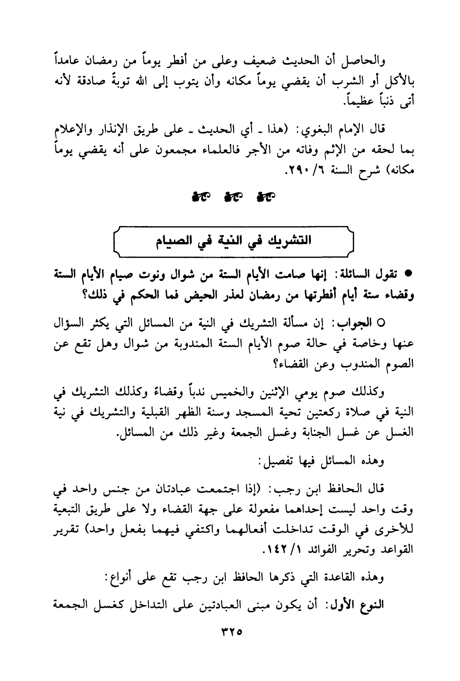 الجواب: إن مسألة التشريك في النية من المسائل التي يكثر السؤال عنها وخاصة في حالة صوم الأيام الستة المندوبة من شوال وهل تقع عن الصوم المندوب وعن القضاء؟