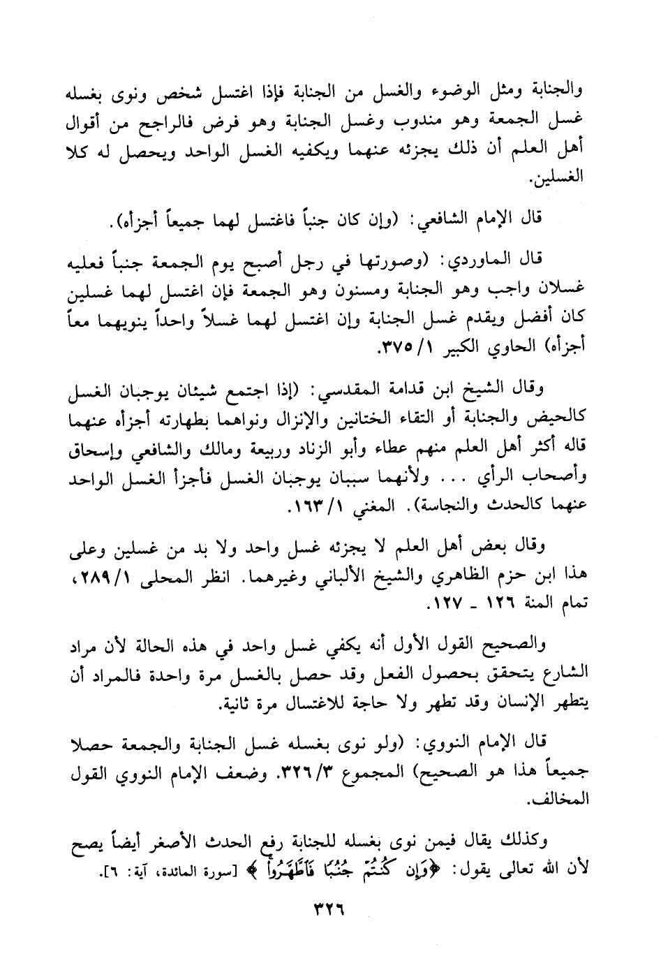 وقال الشيخ ابن قدامة المقدسي: [إذا اجتمع شيئان يوجبان الغسل كالحيض والجنابة أو التقاء الختانين والإنزال ونواهما بطهارته أجزأه عنهما قاله أكثر أهل العلم منهم عطاء وأبو الزناد وربيعة ومالك والشافعي وإسحاق وأصحاب الرأي. ولأنهما سببان يوجبان الغسل فأجزأ الغسل الواحد عنهما كالحدث والنجاسة].