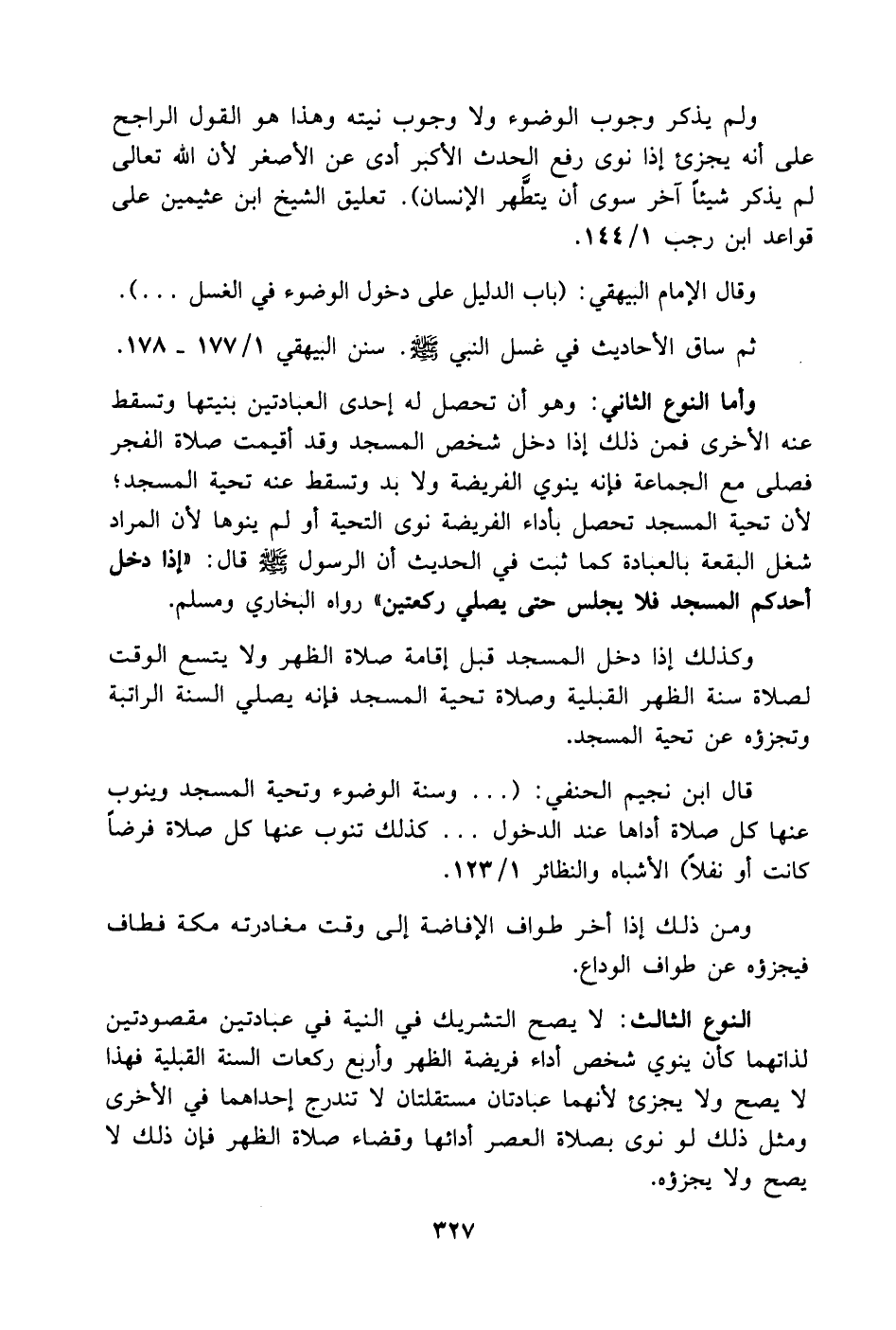وأما النوع الثاني: وهو أن تحصل له إحدى العبادتين بنيتها وتسقط عنه الأخرى فمن ذلك إذا دخل شخص المسجد وقد أقيمت صلاة الفجر فصلى مع الجماعة فإنه ينوي الفريضة ولا بد وتسقط عنه تحية المسجد.