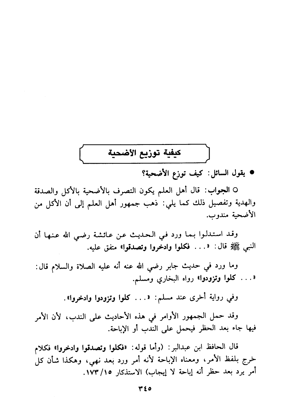 قال الحافظ ابن عبد البر: [وأما قوله: (فكلوا وتصدقوا وادخروا) فكلام خرج بلفظ الأمر، ومعناه الإباحة لأنه أمر ورد بعد نهي، وهكذا شأن كل أمر يرد بعد حظر أنه إباحة لا إيجاب] الاستذكار 15/ 173.