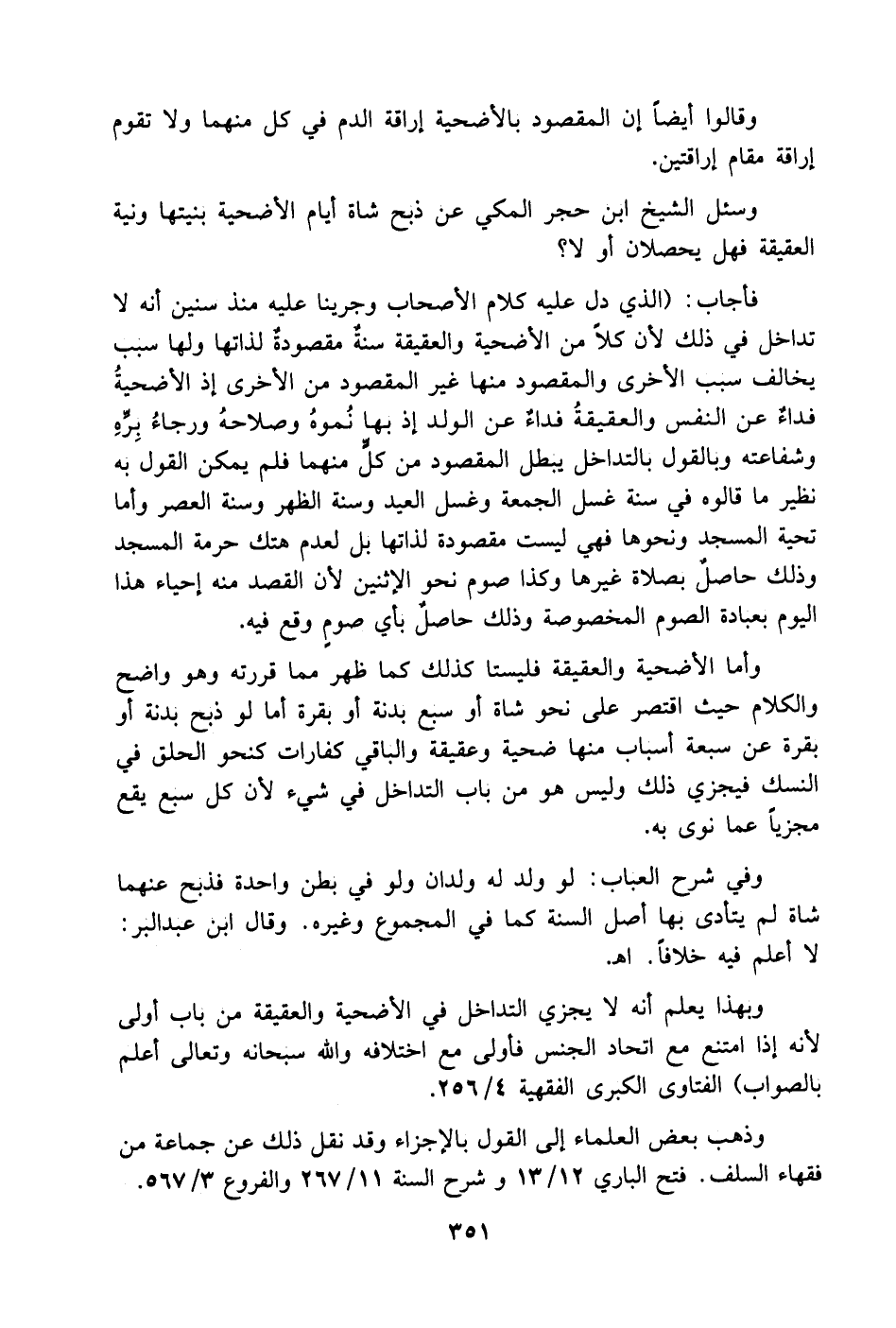 فأجاب: [الذي دل عليه كلام الأصحاب وجرينا عليه منذ سنين أنه لا تداخل في ذلك لأن كلاً من الأضحية والعقيقة سنةٌ مقصودةٌ لذاتها ولها سبب يخالف سبب الأخرى والمقصود منها غير المقصود من الأخرى إذ الأضحيةُ فداءٌ عن النفس والعقيقةُ فداءٌ عن الولد إذ بها نُمُّوهُ وصلاحهُ ورجاءُ بِرِّهِ وشفاعته وبالقول بالتداخل يبطل المقصود من كلٍ منهما فلم يمكن القول به نظير ما قالوه في سنة غسل الجمعة وغسل العيد وسنة الظهر وسنة العصر وأما تحية المسجد ونحوها فهي ليست مقصودة لذاتها بل لعدم هتك حرمة المسجد وذلك حاصلٌ بصلاة غيرها وكذا صوم نحو الاثنين لأن القصد منه إحياء هذا اليوم بعبادة الصوم المخصوصة وذلك حاصلٌ بأي صومٍ وقع فيه.