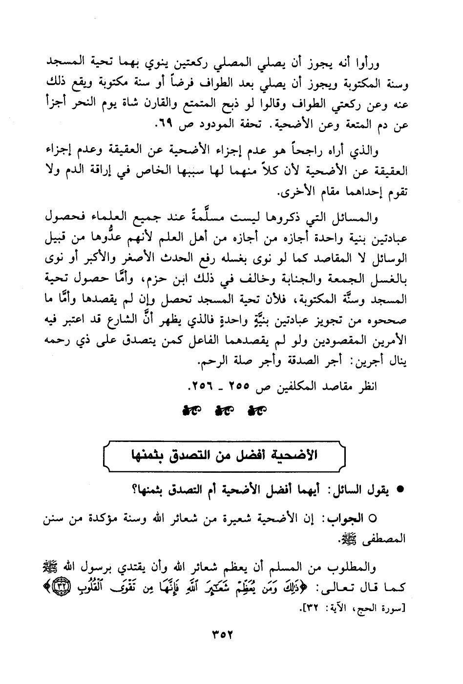 ورأوا أنه يجوز أن يصلي المصلي ركعتين ينوي بهما تحية المسجد وسنة المكتوبة ويجوز أن يصلي بعد الطواف فرضاً أوسنة مكتوبة ويقع ذلك عنه وعن ركعتي الطواف وقالوا لو ذبح المتمتع والقارن شاة يوم النحر أجزأ عن دم المتعة وعن الأضحية. تحفة المودود ص 69.