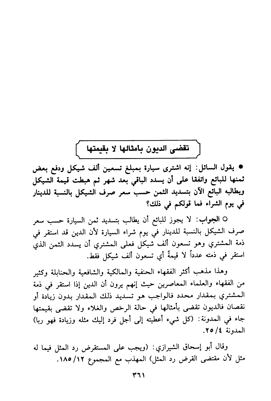 وهذا مذهب أكثر الفقهاء الحنفية والمالكية والشافعية والحنابلة وكثير من الفقهاء والعلماء المعاصرين حيث إنهم يرون أن الدين إذا استقر في ذمة المشتري بمقدار محدد فالواجب هو تسديد ذلك المقدار بدون زيادة أو نقصان فالديون تقضى بأمثالها في حالة الرخص والغلاء ولا تقضى بقيمتها جاء في المدونة: [كل شيء أعطيته إلى أجل فرد إليك مثله وزيادة فهو ربا] المدونة 4/ 25.