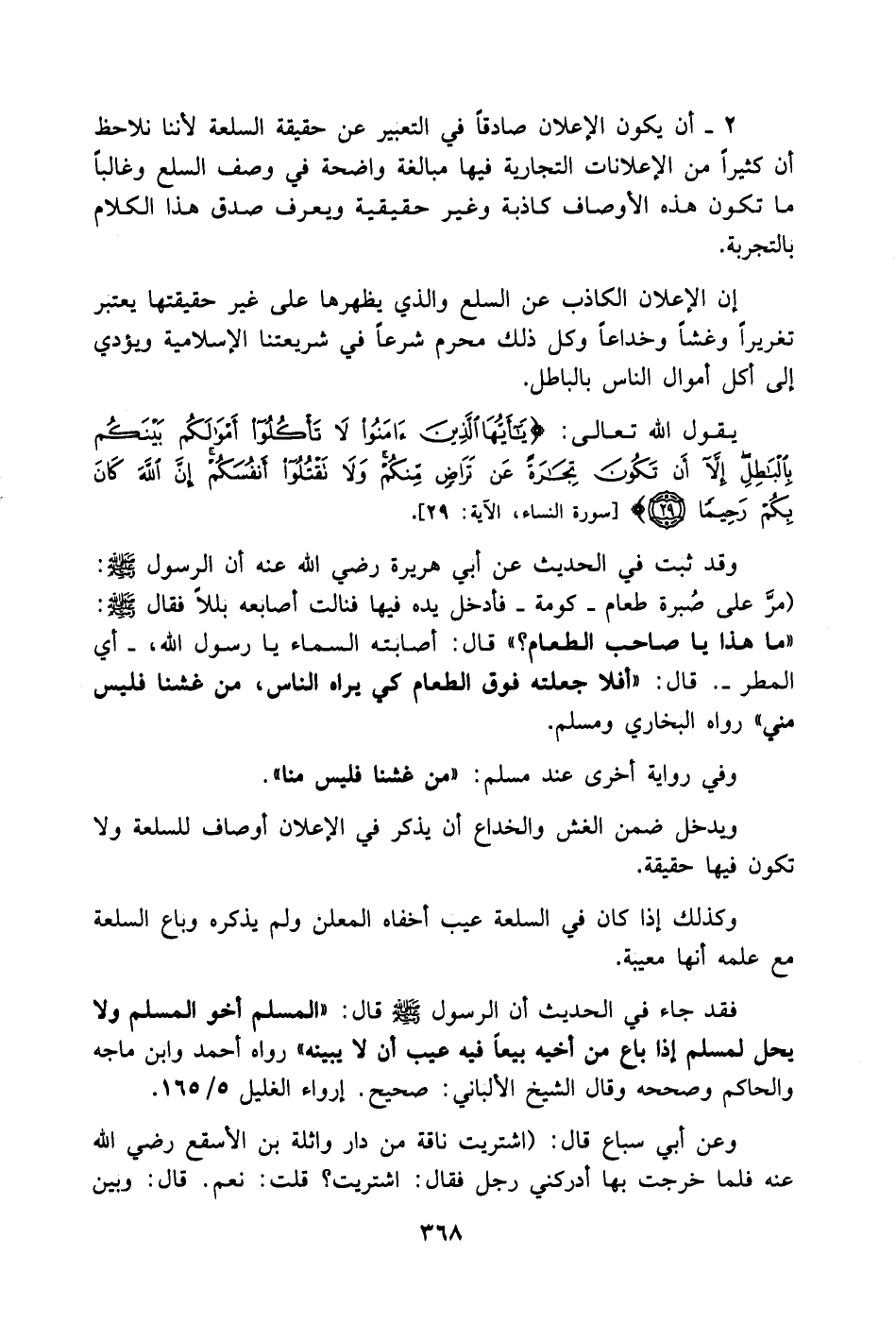 فقد جاء في الحديث أن الرسول - صلى الله عليه وسلم - قال: (المسلم أخو المسلم ولا يحل لمسلم إذا باع من أخيه بيعاً فيه عيب أن لا يبينه) رواه أحمد وابن ماجة والحاكم وصححه وقال الشيخ الألباني: صحيح. إرواء الغليل 5/ 165.