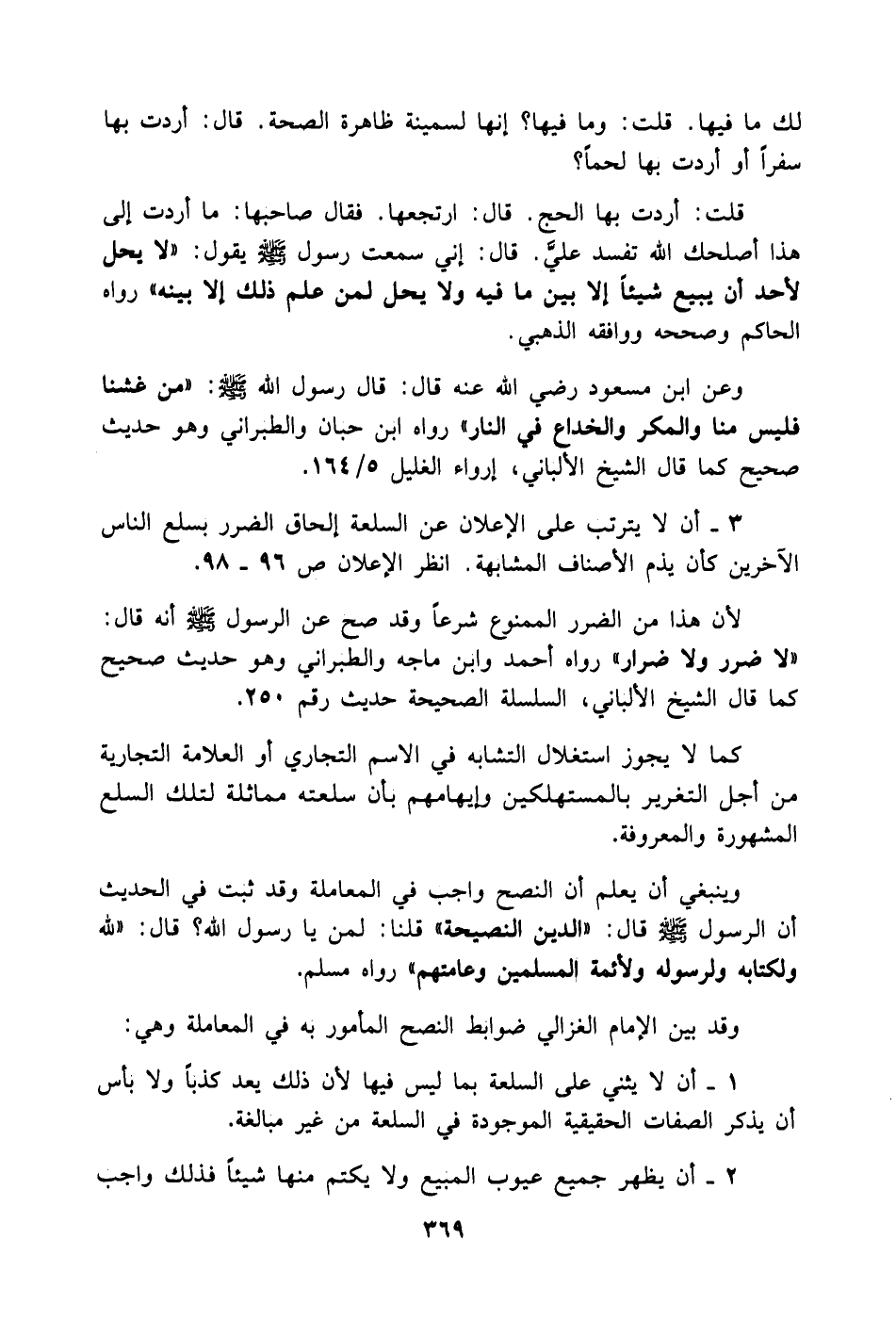 3. أن لا يترتب على الإعلان عن السلعة إلحاق الضرر بسلع الناس الآخرين كأن يذم الأصناف المشابهة. انظر الإعلان ص 96 - 98.