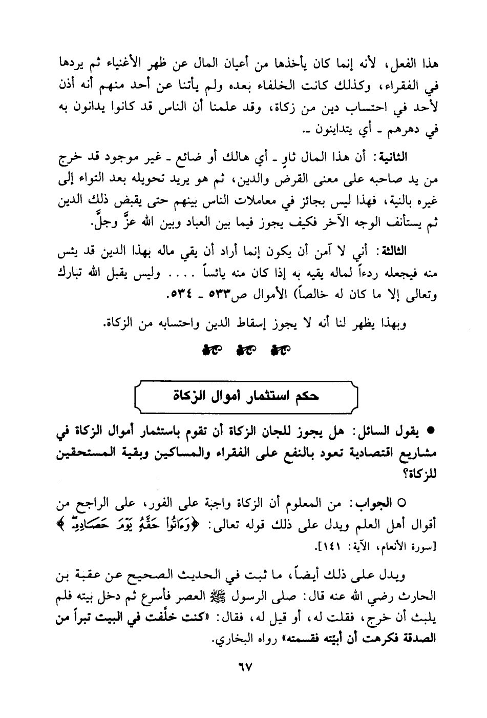 الثانية: أن هذا المال ثاوٍ - أي هالك أو ضائع - غير موجود قد خرج من يد صاحبه على معنى القرض والدين، ثم هو يريد تحويله بعد التواء إلى غيره بالنية، فهذا ليس بجائز في معاملات الناس بينهم حتى يقبض ذلك الدين ثم يستأنف الوجه الأخر فكيف يجوز فيما بين العباد وبين الله عز وجل.