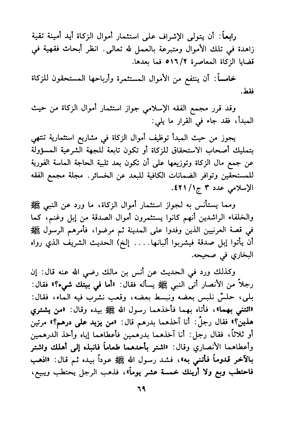 ومما يستأنس به لجواز استثمار أموال الزكاة، ما ورد عن النبي- صلى الله عليه وسلم - والخلفاء الراشدين أنهم كانوا يستثمرون أموال الصدقة من إبل وغنم، كما في قصة العرنيين الذين وفدوا على المدينة ثم مرضوا، فأمرهم الرسول- صلى الله عليه وسلم - أن يأتوا إبل صدقة فيشربوا ألبانها .... الخ) الحديث الشريف الذي رواه البخاري في صحيحه.