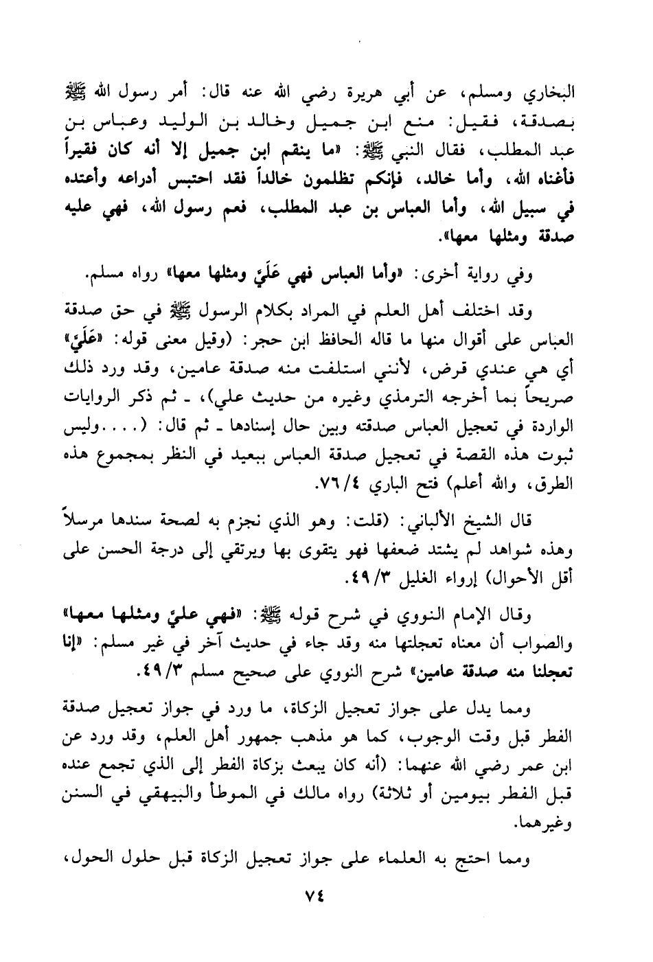 وقد اختلف أهل العلم في المراد بكلام الرسول - صلى الله عليه وسلم - في حق صدقة العباس على أقوال منها ما قاله الحافظ ابن حجر: " وقيل معنى قوله (عَلَيَّ) أي هي عندي قرض، لأنني استلفت منه صدقة عامين، وقد ورد ذلك صريحاً بما أخرجه الترمذي وغيره من حديث علي "، - ثم ذكر الروايات الواردة في تعجيل العباس صدقته وبين حال إسنادها - ثم قال: " .... وليس ثبوت هذه القصة في تعجيل صدقة العباس ببعيد في النظر بمجموع هذه الطرق، والله أعلم " فتح الباري 4/ 76.