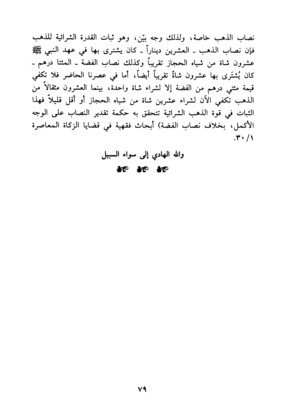 نصاب الذهب خاصة، ولذلك وجه بيّن، وهو ثبات القدرة الشرائية للذهب فإن نصاب الذهب - العشرين ديناراً - كان يشترى بها في عهد النبي - صلى الله عليه وسلم - عشرون شاة من شياه الحجاز تقريباً وكذلك نصاب الفضة - المئتا درهم - كان يُشتَرى بها عشرون شاةً تقريباً أيضاً، أما في عصرنا الحاضر فلا تكفي قيمة مئتي درهم من الفضة إلا لشراء شاة واحدة، بينما العشرون مثقالاً من الذهب تكفي الآن لشراء عشرين شاة من شياه الحجاز أو أقل قليلاً فهذا الثبات في قوة الذهب الشرائية تتحقق به حكمة تقدير النصاب على الوجه الأكمل، بخلاف نصاب الفضة " أبحاث فقهية في قضايا الزكاة المعاصرة 1/ 30.