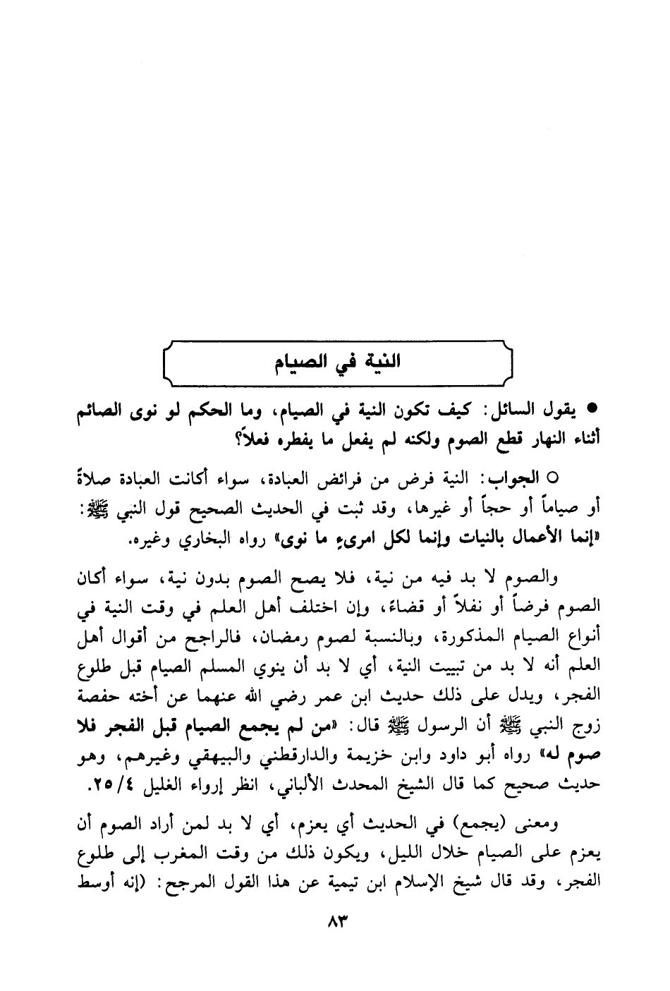 الجواب: النية فرض من فرائض العبادة، سواء أكانت العبادة صلاةً أو صياماً أو حجاً أو غيرها، وقد ثبت في الحديث الصحيح قول النبي - صلى الله عليه وسلم -: (إنما الأعمال بالنيات وإنما لكل امرئٍ ما نوى) رواه البخاري وغيره.