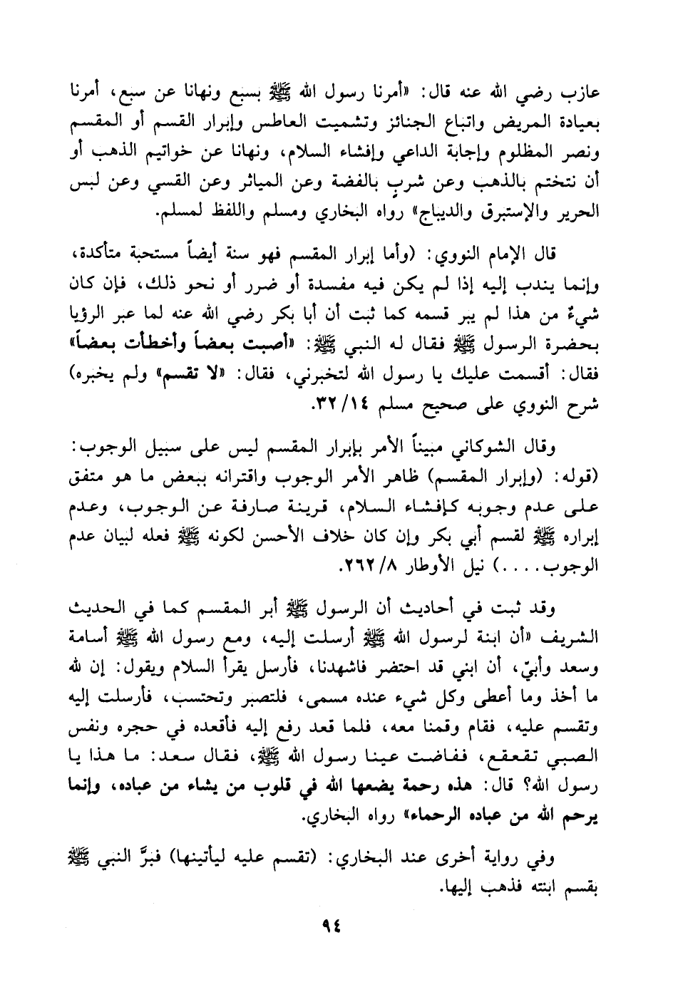 وقد ثبت في أحاديث أن الرسول - صلى الله عليه وسلم - أبر المقسم كما في الحديث الشريف (أن ابنة لرسول الله - صلى الله عليه وسلم - أرسلت إليه، ومع رسول الله - صلى الله عليه وسلم - أسامة وسعد وأبيّ، أن ابني قد احتضر فاشهدنا، فأرسل يقرأ السلام ويقول: إن لله ما أخذ وما أعطى وكل شيء عنده مسمى، فلتصبر وتحتسب، فأرسلت إليه وتقسم عليه، فقام وقمنا معه، فلما قعد رفع إليه فأقعده في حجره ونفس الصبي تقعقع، ففاضت عينا رسول الله - صلى الله عليه وسلم -، فقال سعد: ما هذا يا رسول الله؟ قال: هذه رحمة يضعها الله في قلوب من يشاء من عباده، وإنما يرحم الله من عباده الرحماء) رواه البخاري.