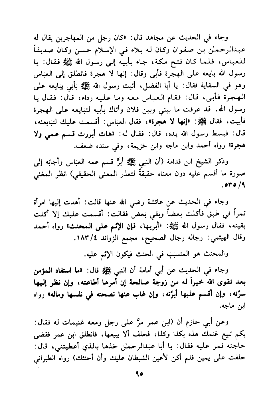 وجاء في الحديث عن عائشة رضي الله عنها قالت: (أهدت إليها امرأة تمراً في طبق فأكلت بعضاً وبقي بعض فقالت: أقسمت عليك إلا أكلت بقيته، فقال رسول الله - صلى الله عليه وسلم -: أبريها، فإن الإثم على المحنث) رواه أحمد وقال الهيثمي: رجاله رجال الصحيح، مجمع الزوائد 4/ 183.