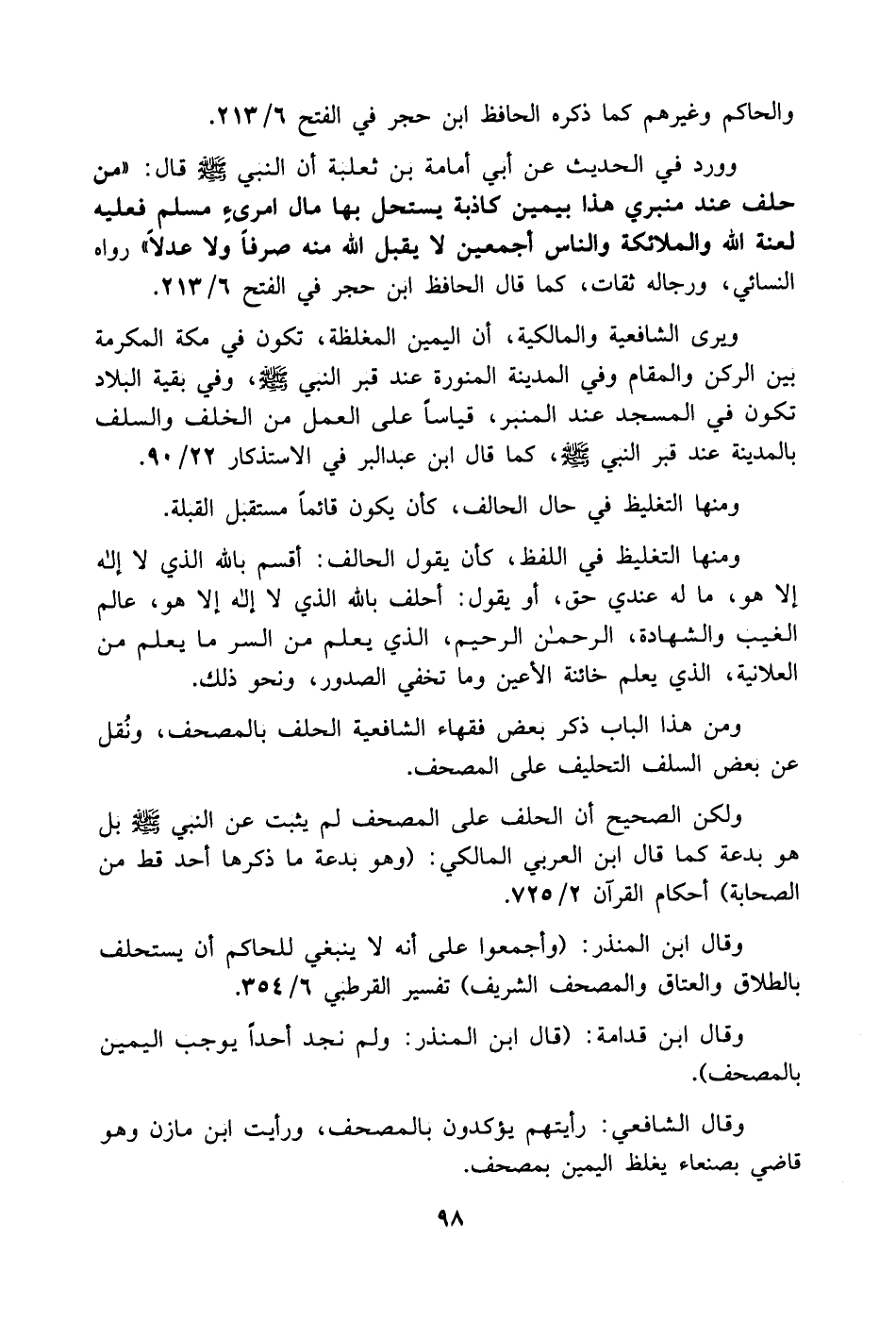 وقال ابن قدامة: " قال ابن المنذر: ولم نجد أحداً يوجب اليمين بالمصحف.