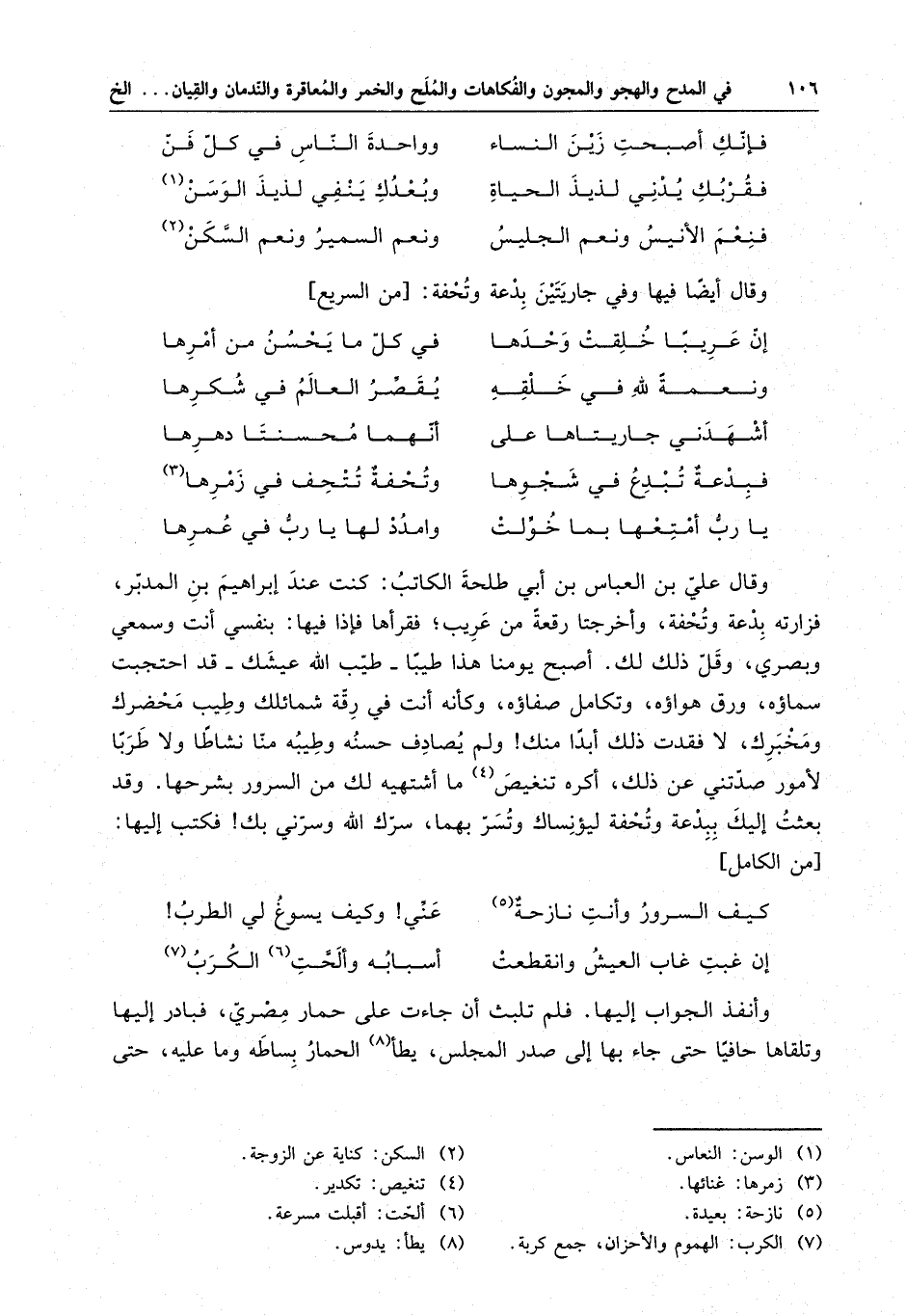 وقال علي بن العباس بن طلحة الكاتب : كنت عند إبراهيم المدبر ، فزارته بدعة وتحفة ، وأخرجتا رقعةً من عريب ، فقرأها فإذا فيها : بنفسي أنت وسمعي وبصري ، وقل ذلك لك . أصبح يومنا هذا طيباً - طيب الله عيشك - قد احتجبت سماؤه ، ورق هواؤه ، وتكامل صفاؤه ، وكأنه أنت في رقة شمائلك وطيب محضرك ومخبرك ، لا فقدت ذلك أبداً منك ولم يصادف حسنه وطيبه منا نشاطاً ولا طرباً لأمورٍ صدتني عن ذلك ، أكره تنغيص ما أشتهيه لك من السرور بشرحها . وقد بعثت إليك ببدعةٍ وتحفةٍ ليؤنساك وتسر بهما ، سرك الله وسرني بك . فكتب إليها :