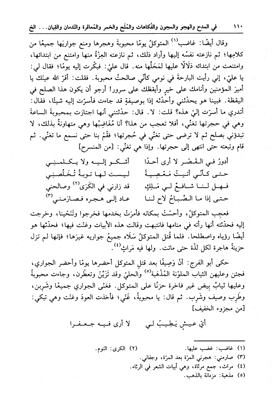 وقال أيضاً : غاضب المتوكل يوماً محبوبة وهجرها ومنع جواريها جميعاً من كلامها ، ثم نازعته نفسه إليها وأراد ذلك ، ثم نازعته العزة منها وامتنع من ابتدائها ، وامتنعت من ابتدائه دلالاً عليه لمحلها منه . قال علي : فبكرت إليه يوماً ، فقال لي : يا علي ، إني رأيت البارحة في نومي كأني صالحت محبوبة . فقلت : أقر الله عينك يا أمير المؤمنين وأنامك على خيرٍ وأيقظك على سرورٍ أرجو أن يكون هذا الصلح في اليقظة . فبينا هو يحدثني وأحدثه إذا بوصيفةٍ قد جاءت فأسرت إليه شيئاً ، فقال : أتدري ما أسرت إلي هذه ؟ قلت : لا . قال : حدثتني أنها اجتازت بمحبوبة الساعة وهي في حجرتها تغني ، أفلا تعجب من هذا ؟ أنا مغاضبها وهي متهاونةٌ بذلك ، لا تبدؤني بصلحٍ ثم لا ترضى حتى تغني في حجرتها ، فقم بنا نسمع ما تغنني . ثم قام وتبعته حتى انتهى إلى حجرتها ، وإذا هي تغني :