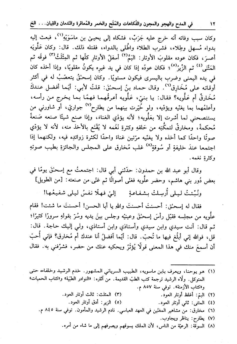 فقال له إسحاق : أحسنت أحسنت والله يا أبا الحسن أحسنت ما شئت فقام علويه من مجلسه فقبل رأس إسحاق وعينيه وجلس بين يديه وسر بقوله سروراً كثيراً ، ثم قال أنت سيدي وابن سيدي وأستاذي وابن أستاذي ، ولي إليك حاجةٌ . قال : قل ، فوالله إني أبلغ فيها ما تحب . قال : أيما أفضل أنا عندك أم مخارق ؟ فإني أحب أن أسمع منك في هذا المعنى قولاً يؤثر ويحكيه عنك من حضر ، فشرفني به . فقال