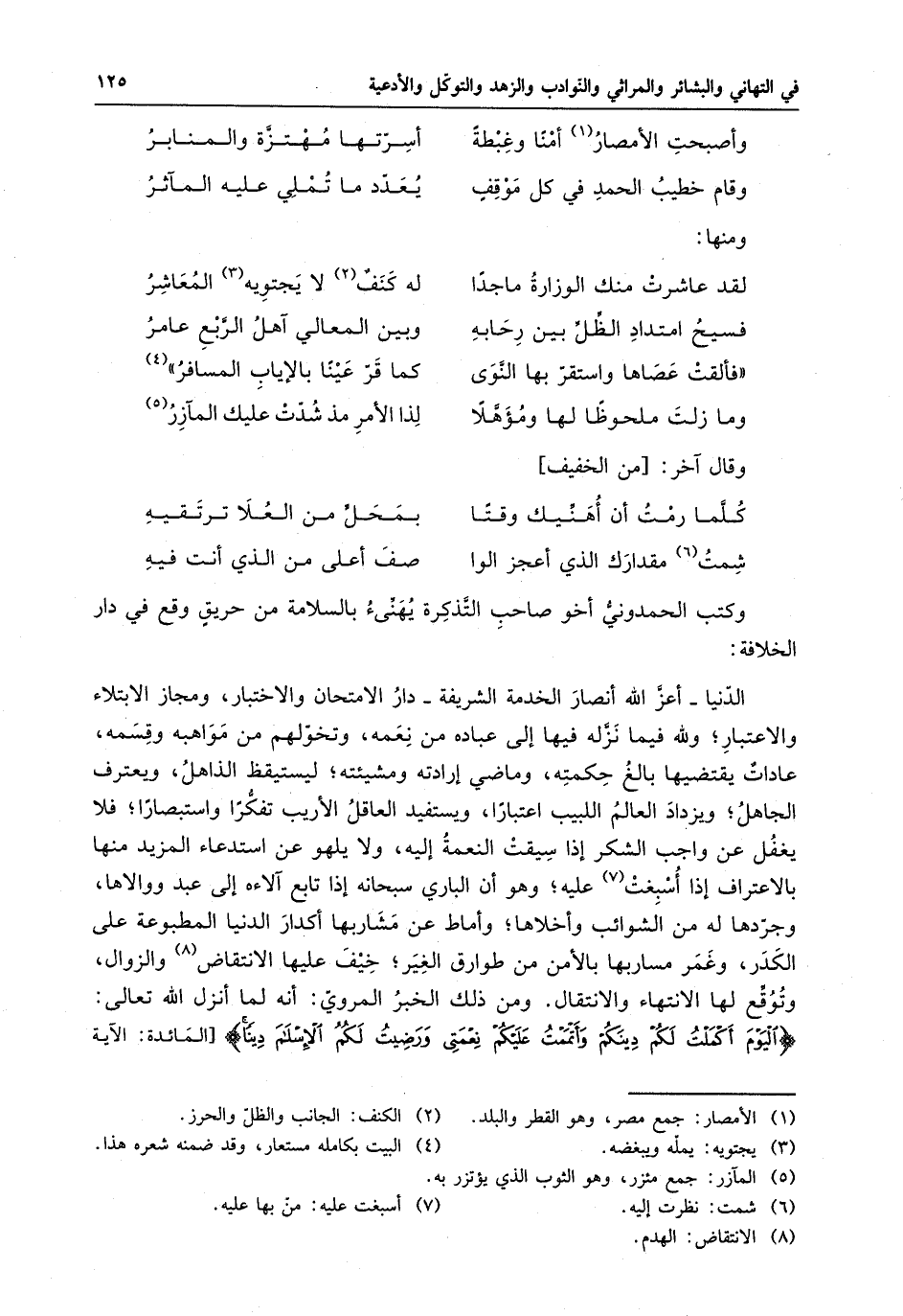 شمت مقدارك الذي أعجز الوا . . . صف أعلى من الذي أنت فيه وكتب الحمدوني أخو صاحب التذكرة يهنئ بالسلامة من حريقٍ وقع في دار الخلافة : الدنيا - أعز الله أنصار الخدمة الشريفة - دار الامتحان والاختبار ، ومجاز الابتلاء والاعتبار ، ولله فيما نزله فيها إلى عباده من نعمه ، وتخولهم من مواهبه وقسمه ، عاداتٌ يقتضيها بالغ حكمته ، وماضي إرادته ومشيئته ، ليستيقظ الذاهل ، ويعترف الجاهل ، ويزداد العالم اللبيب اعتباراً ، ويستفيد العاقل الأريب تفكراً واستبصاراً ، فلا يغفل عن واجب الشكر إذا سيقت النعمة إليه ، ولا يلهو عن استدعاء المزيد منها بالاعتراف إذا أسبغت عليه ، وهو أن الباري سبحانه إذا تابع آلاءه إلى عبدٍ ووالاها ، وجردها له من الشوائب وأخلاها ، وأماط عن مشاربها أكدار الدنيا المطبوعة على الكدر ، وغمر مساربها بالأمن من طوارق الغير ، خيف عليها الانتقاض والزوال ، وتوقع لها الانتهاء والانتقال . ومن ذلك الخبر المروي : أنه لما أنزل الله تعالى " اليوم أكملت لكم دينكم وأتممت عليكم نعمتي ورضيت لكم الإسلام دينا "