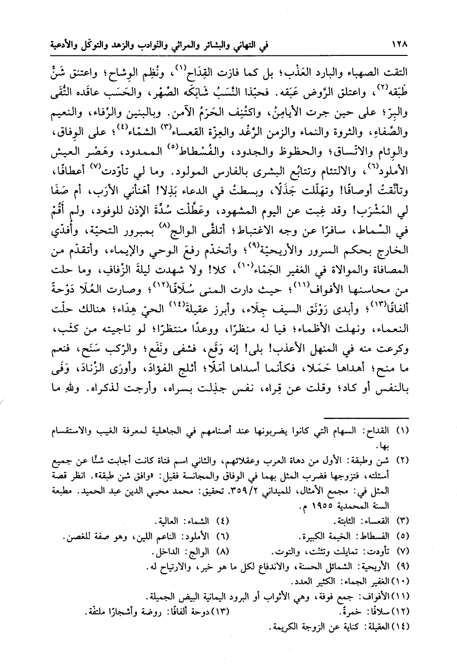 التقت الصهباء والبارد العذب ، بل كما فازت القداح ، ونظم الوشاح ، واعتنق شنٌ طبقه ، واعتلق الروض عبقه . فحبذا النسب شابكه الصهر ، والحسب عاقده التقى والبر ، على حين جرت الأيامن ، واكتنف الحرم الآمن . وبالبين والرفاء ، والنعيم والصفاء ، والثروة والنماء ، والزمن الرغد والعزة القعساء الشماء ، على الوفاق ، والوئام والاتساق ، والحظوظ والجدود ، والفسطاط الممدود ، وهصر العيش الأملود ، والالتئام وتتابع البشرى بالفارس المولود . ومالي تأودت أعطافها ، وتأنقت أوصافاً وتهللت جذلاً ، وبسطت في الدعاء مذلاً أهنأي الأرب ، أم صفا المشرب وقد غبت عن اليوم المشهود ، وعطت سدة الأذن للوفود ، ولم أقم في السماط ، سافراً عن وجه الاغتباط ، أتلقى الوالج بمرور التحية ، وأفدي الخارج بحكم السرور والأريحية ، وأتخدم رفع الوحي والإيماء ، وأتقدم من المصافاة والموالاة في الغفير الجماء ، كلا ولا شهدت ليلة الزفاف ، وما حلت من محاسنها الأفواف ، حيث دارت المنى سلافاً ، وصارت العلا دوحةً ألفافاً ، وأبدى رونق السيف جلاء ، وأبرز عقيلة الحي هداء ، هنالك حلت النعماء ، ونهلت الأظماء ، فياله منظراً ، ووعداً منتظراً ، لو ناجيته من كثب ، وكرعت منه في المنهل الأعذب بلى إنه وقع ، فشفى ونفع ، والركب سنح ، فنعم ما منح ، أهداها حملاً ، فكأنما أسداها أملاً ، أثلج الفؤاد ، وأروى الزناد ، وفي النفس أو كاد ، وقلت عن قراه ، نفسٍ جذلت بسراه ، وأرجت لذكراه . والله ما