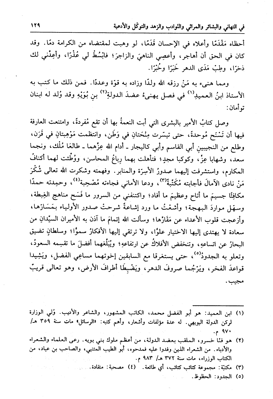من رزقه الله ولداً فمن ذلك ما كتب به الأستاذ ابن العميد في فصلٍ يهنئ عضد الدولة بن بويه وقد ولد له ابنان توءمان : وصل كتاب الأمير بالبشرى التي أبت النعمة بها أن تقع مفردةً ، وامتنعت العارفة فيها أن تسنح موحدةً ، حتى تيسرت منحتان في وطنٍ ، وانتظمت موهبتان في قرنٍ ، وطلع من النجيبين أبي قاسم وأبي كاليجار - أدام الله عزهما - طالعا ملك ، ونجما سعدٍ ، وشهابا عزٍ ، وكوكبا مجدٍ ، فتأهلت بهما رباع المحاسن ، ووطئت لهما أكناف المكارم ، واستشرفت إليهما صدور الأسرة والمنابر . وفهمته وشكرت الله تعالى شكر من نادى الآمال فأجابته مكتبةً ، ودعا الأماني فجاءته مصحبةً ، وحمدته حمداً مكافئاً جسيم ما أتاح وعظيم ما أفاد ، واكتنفني من السرور ما فسح مناهج الغبطة ، وسهل موارد البهجة ، وأشعت ما ورد إشاعةً شرحت صدور الأولياء بمسارها ، وأزعجت قلوب الأعداء عن مقارها ، وسألت الله إتمام ما آذن به الأميران السيدان من سعادةٍ لا يهتدي إليها الاختيار علواً ، ولا ترتقي إليها الأفكار سمواً ، وسلطانٍ تضيق البحار عن اتساعه ، وتنخفض الأفلاك عن ارتفاعه ، ويبلغهما أفضل ما تقسمه السعود ، وتعلو به الجدود ، حتى يستغرقا مع السابقين إخوتهما مساعي الفضل ، ويشيدا قواعد الفخر ، ويرجما صروف الدهر ، ويضبطا أطراف الأرض ، وهو تعالى قريبٌ مجيب .