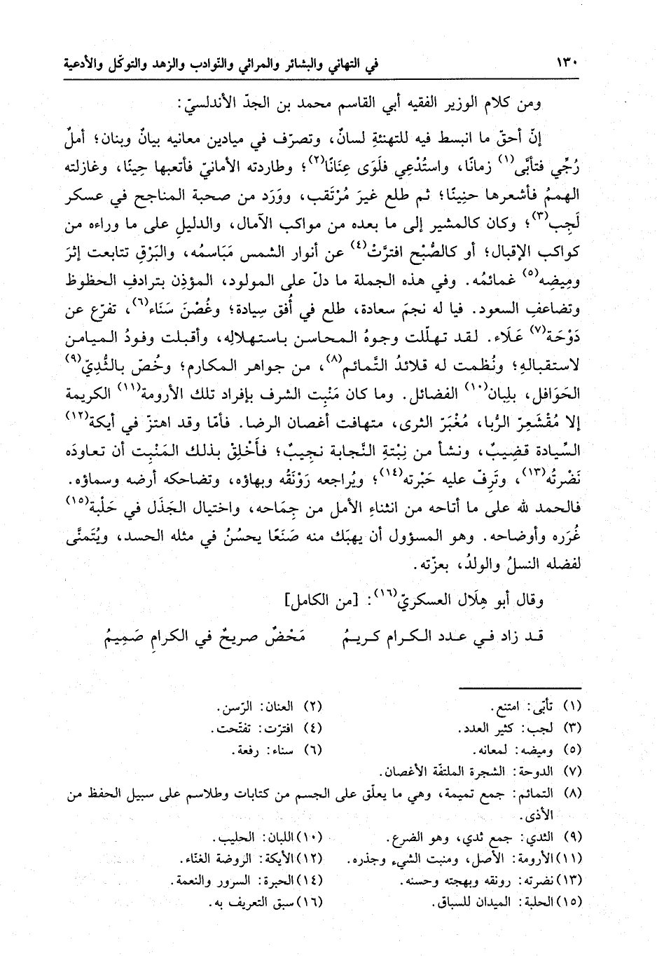ومن كلام الوزير الفقيه أبي القاسم محمد بن الجد الأندلسي : إن أحق ما انبسط فيه للتهنئة لسانٌ ، وتصرف في ميادين معانيه بيانٌ وبنان ، أملٌ رجي فتأبا زماناً ، واستدعي فلوى عناناٍ ، وطاردته الأماني فأتعبته حيناً ، وغازلته الهمم فأشعرها حنيناً ، ثم طلع غير مرتقبٍ ، وورد من صحبة المناجح في عسكرٍ لجب ، وكان كالمشير إلى ما بعده من مواكب الآمال ، والدليل على ما وراءه من كواكب الإقبال ، أو كالصبح افترت عن أنوار الشمس مباسمه ، والبرق تتابعت إثر وميضه غمائمه . وفي هذه الجملة ما دل على المولود ، المؤذن بترادف الحظوظ وتضاعف السعود . فياله نجم سعادةٍ ، طلع في أفق سيادةٍ ، وغصن سناءٍ ، تفرع عن دوحة علاءٍ ، لقد تهللت وجوه المحاسن باستهلاله ، وأقبلت وفود الميامن لاستقباله ، ونظمت له قلائد التمائم ، من جواهر المكارم ، وخص بالثدي الحوافل ، بلبان الفضائل . وما كان منبت الشرف بإفراد تلك الأرومة الكريمة إلا مقشعر الربا ، مغبر الثرى ، متهافت أغصان الرضا ، فأما وقد اهتز في أيكة السيادة قضيبٌ ، ونشأ من نبتته النجابة نجيب ، فأخلق بذلك المنبت أن تعاوده نضرته ، وترف عليه حبرته ، ويراجعه رونقه وبهاؤه ، وتضاحكه أرضه وسماؤه . فاحمد لله على ما أتاحه من انثناء الأمل من جماحه ، واختيال الجذل في حلبة غرره وأوضاحه . وهو المسئول أن يهبك منه صنعاً يحسن في مثله الحسد ، ويتمنى لفضله النسل والولد ، بعزته .