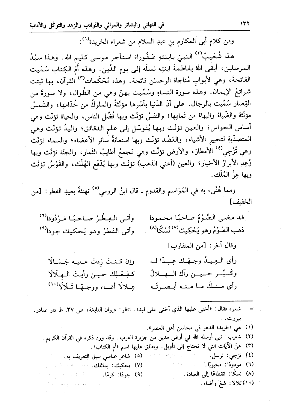 مما هنئ به في المواسم والقدوم قال ابن الرومي تهنئةً بعيد الفطر : قد مضى الصوم صاحباً محموداً . . . وأتى الفطر صاحباً مودوداً