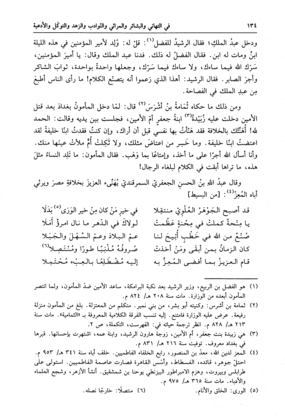 ومن ذلك ما حكاه ثمامة بن أشرس قال : لما دخل المأمون بغداد بعد قتل الأمين دخلت عليه زبيدة بنة جعفر أم الأمين ، فجلست بين يديه وقالت : الحمد لله إن أهنئك بالخلافة فقد هنأت بها نفسي قبل أن أراك ، وإن كنت فقدت ابناً خليفةً لقد اعتضدت ابناً خليفةً . وما خسر من اعتاض مثلك ، ولا ثكلت أمٌ ملأت عينها منك . وأنا أسأل الله أجراً على ما أخذ ، وإمتاعاً بما وهب . فقال المأمون : ما تلد النساء مثل هذه ، ما تراها أبقت في الكلام لبلغاء الرجال وقال عبد الله بن الحسن الجعفري السمرقندي يهنئ العزيز بخلافة مصر ويرثي أباه المعز :