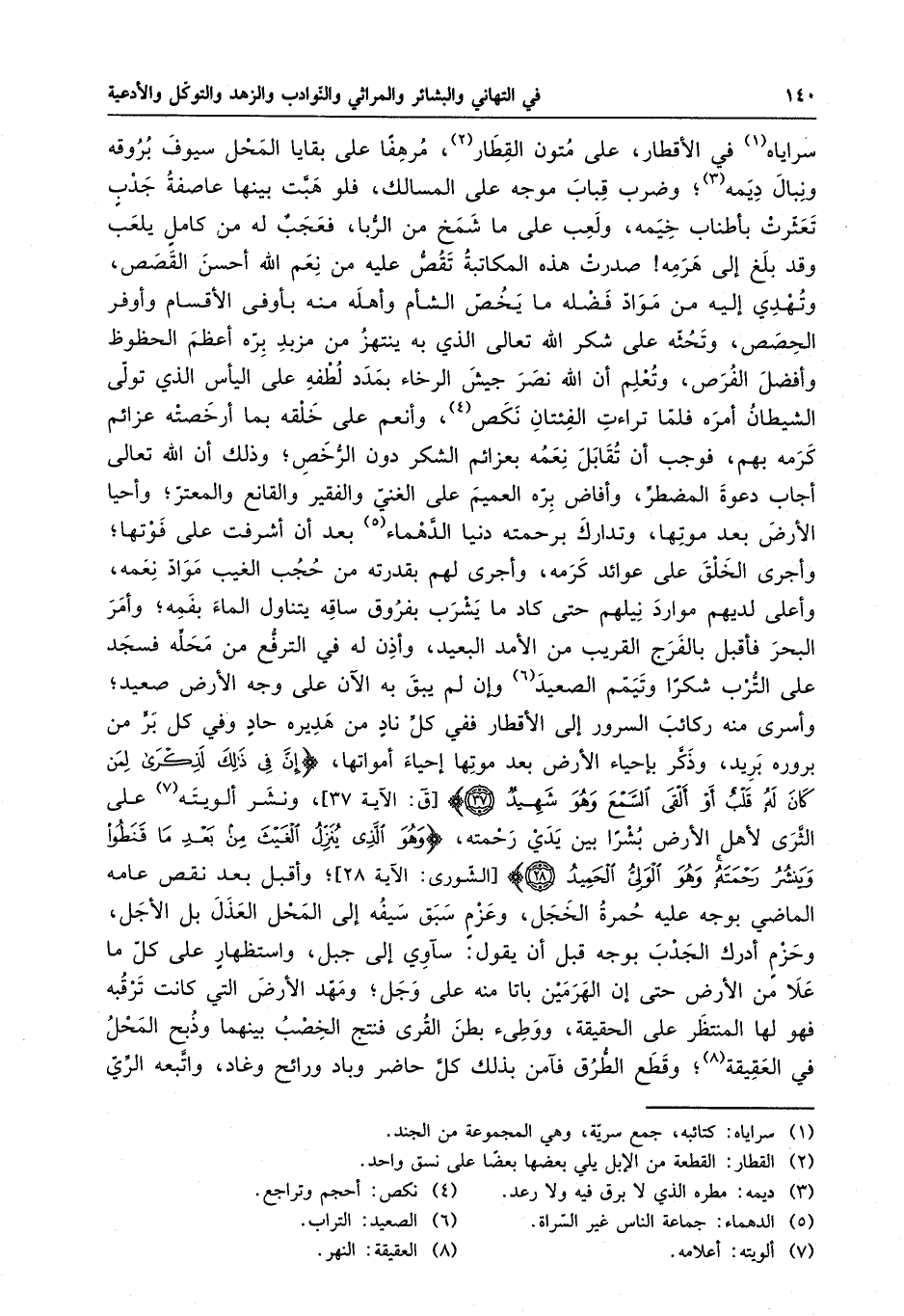 سراياه في الأقطار ، على متون القطار ، مرهفاً على بقايا المحل سيوف بروقه ونبال ديمه ، وضرب قباب موجه على المسالك ، فلو هبت بينهما عاصفة جدبٍ تعثرت بأطناب خيمه ، ولعب على ما شمخ من الربا ، فعجبٌ له من كاملٍ يلعب وقد بلغ إلى هرمه صدرت هذه المكاتبة تقص عليه من نعم الله أحسن القصص ، وتهدي إليه من مواد فضله ما يخص الشام وأهله منه بأوفى الأقسام وأوفر الحصص ، وتحثه على شكر الله تعالى الذي به ينتهز من مزيد بره أعظم الحظوظ وأفضل الفرص ، وتعلم أن الله نصر جيش الرخاء بمدد لطفه على اليأس الذي تولى الشيطان أمره فلما تراءت الفئتان نكص ، وأنعم على خلقه بما أرخصته عزائم كرمه بهم ، فوجب أن تقابل نعمه بعزائم الشكر دون الرخص ، وذلك أن الله تعالى أجاب دعوة المضطر ، وأفاض بره العميم على الغني والفقير والقانع والمعتر ، وأحيا الأرض بعد موتها ، وتدارك برحمته دنيا الدهماء بعد أن أشرفت على فوتها ، وأجرى الخلق على عوائد كرمه ، وأجرى لهم بقدرته من حجب الغيب مواد نعمه ، وأعلى لديهم موارد نيلهم حتى كاد ما يشرب بفروق ساقه يتناول الماء بفمه ، وأمر البحر فأقبل بالفرج القريب من الأمد البعيد ، وأذن له في الترفع من محله فسجد على الترب شكراً وتيمم الصعيد وإن لم يبق به الآن على وجه الأرض صعيد ، وأسرى منه ركائب السرور إلى الأقطار ففي كل نادٍ من هديره حادٍ وفي كل برٍ من بروره بريد ، وذكر بإحياء الأرض بعد موتها إحياء أمواتها ، " إن في ذلك لذكرى لمن كان له قلبٌ أو ألقى السمع وهو شهيد " ، ونشر ألويته على الثرى لأهل الأرض بشراً بين يدي رحمته ، " وهو الذي ينزل الغيث من بعد ما قنطوا وينشر رحمته وهو الولي الحميد " ، وأقبل بعد نقص عامه الماضي بوجهٍ عليه حمرة الخجل ، وعزمٍ سبق سيفه إلى المحل العذل بل الأجل ، وحزمٍ أدرك الجدب بوجهٍ قبل أن يقول : سآوى إلى جبلٍ ، واستظهارٍ على كل ما علا من الأرض حتى إن الهرمين باتا منه على وجل ، ومهد الأرض التي كانت ترقبه فهو لها المنتظر على الحقيقة ، ووطئ بطن القرى فنتج الخصب بينهما وذبح المحل في العقيقة ، وقطع الطرق فآمن بذلك كل حاضرٍ وبادٍ ورائحٍ وغاد ، واتبعه الري