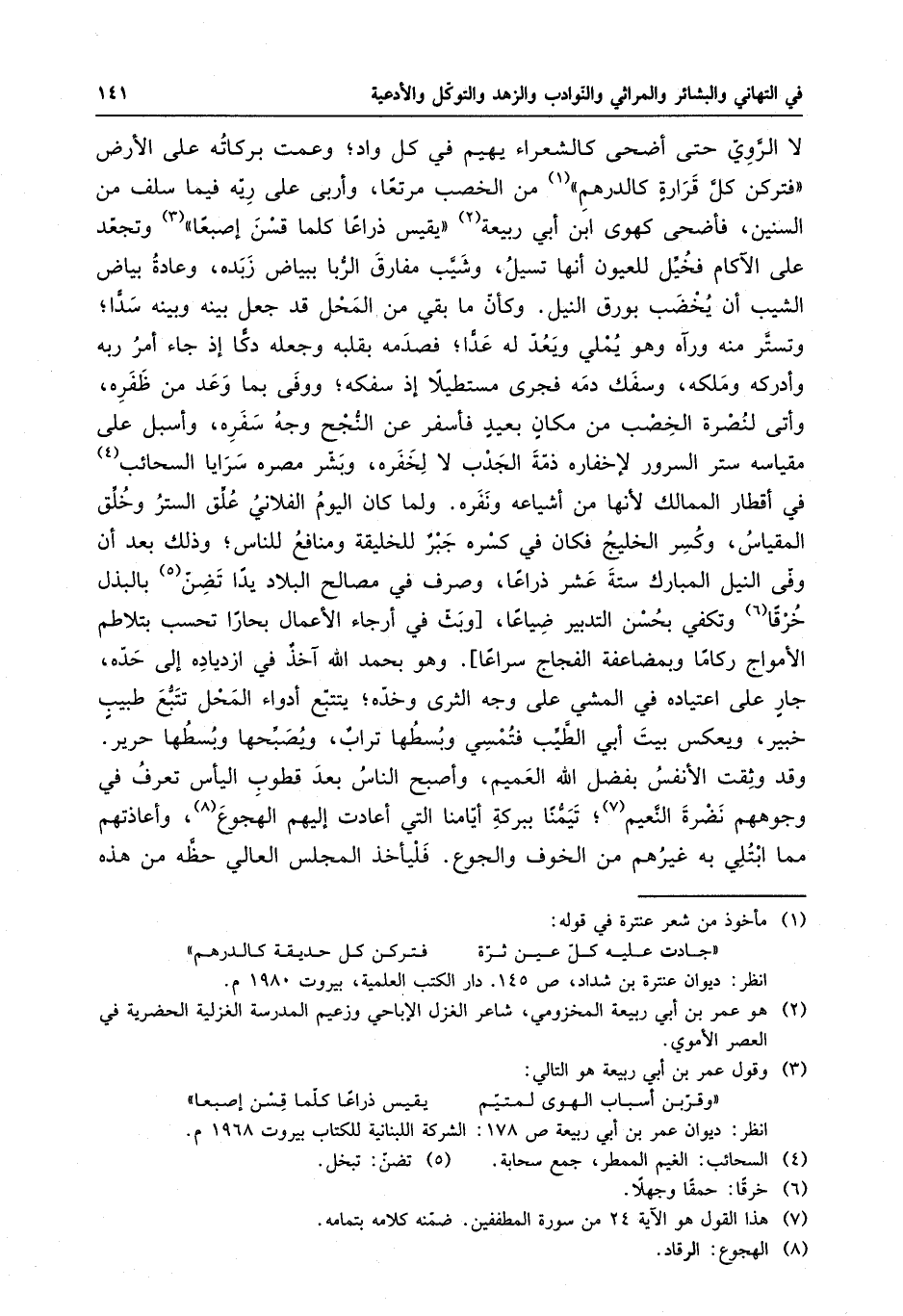 لا الروي حتى أضحى كالشعراء يهيم في كل واد ، وعمت بركاته على الأرض فتركن كل قرارةٍ كالدرهم من الخصب مرتعاً ، وأربى على ريه فيما سلف من السنين ، فأضحى كهوى ابن أبي ربيعة " يقيس ذراعاً كلما قسن إصبعا " ، وتجعد على الآكام فخيل للعيون أنها تسيل ، وشيب مفارق الربا ببياض زبده ، وعادة بياض الشيب أن يخضب بورق النيل . وكأن ما بقي من المحل قد جعل بينه وبينه سداً ، وتستر منه ورآه وهو يملي ويعد له عداً ، فصدمه بقلبه وجعله دكاً إذ جاء أمر ربه وأدركه وملكه ، وسفك دمه فجرى مستطيلاً إذ سفكه ، ووفى بما وعد من ظفره ، وأتى لنصرة الخصب من مكانٍ بعيدٍ فأسفر عن النجح وجه سفره ، وأسبل على مقياسه ستر السرور لإخفاره ذمة الجدب لا لخفره ، وبشر مصره بنصرة سرايا السحائب في أقطار الممالك لأنها من أشياعه ونفره . ولما كان اليوم الفلاني علق الستر وخلق المقياس ، وكسر الخليج فكان في كسره جبرٌ للخليقة ومنافع للناس ، وذلك بعد أن وفى النيل المبارك ستة عشر ذراعاً ، وصرف في مصالح البلاد يداً تضن بالبذل خرقاً وتكفي بحسن التدبير ضياعاً ، وبث في أرجاء الأعمال بحاراً تحسب بتلاطم الأمواج ركاماً وبمضاعفة الفجاج سراعاً . وهو بحمد الله آخذٌ في ازدياده إلى حده ، جارٍ على اعتياده في المشي على وجه الثرى وخده ، يتتبع أدواء المحل تتبع طبيبٍ خبير ، ويعكس بيت أبي الطيب فتمسي وبسطها تراب ، ويصبحها وبسطها حرير . وقد وثقت الأنفس بفضل الله العميم ، وأصبح الناس بعد قطوب اليأس تعرف في وجوههم نضرة النعيم ، تيمناً ببركة أيامنا التي أعادت إليهم الهجوع ، وأعاذتهم مما ابتلي به غيرهم من الخوف والجوع . فليأخذ المجلس العلي حظه من هذه