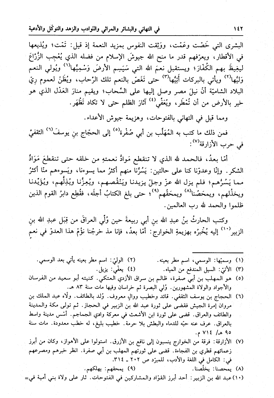 التهاني بالفتوحات وهزيمة الأعداء فمن ذلك ما كتب به المهلب بن أبي صفرة إلى الحجاج بن يوسف الثقفي في حرب الأزارقة : أما بعد فالحمد لله الذي لا تنقطع مواد نعمته من خلقه حتى تنقطع مواد الشكر . وإنا وعدونا كنا على حالتين : يسرنا منهم أكثر ما يسوءنا ، ويسوءهم منا أكثر مما يسرهم ، فلم يزل الله عز وجل يزيدنا وينقصهم ، ويعزنا ويذلهم ، ويؤيدنا ويخذلهم ، ويمحصنا ويمحقهم ، حتى بلغ الكتاب أجله ، فقطع دابر القوم الذين ظلموا والحمد لله رب العالمين .