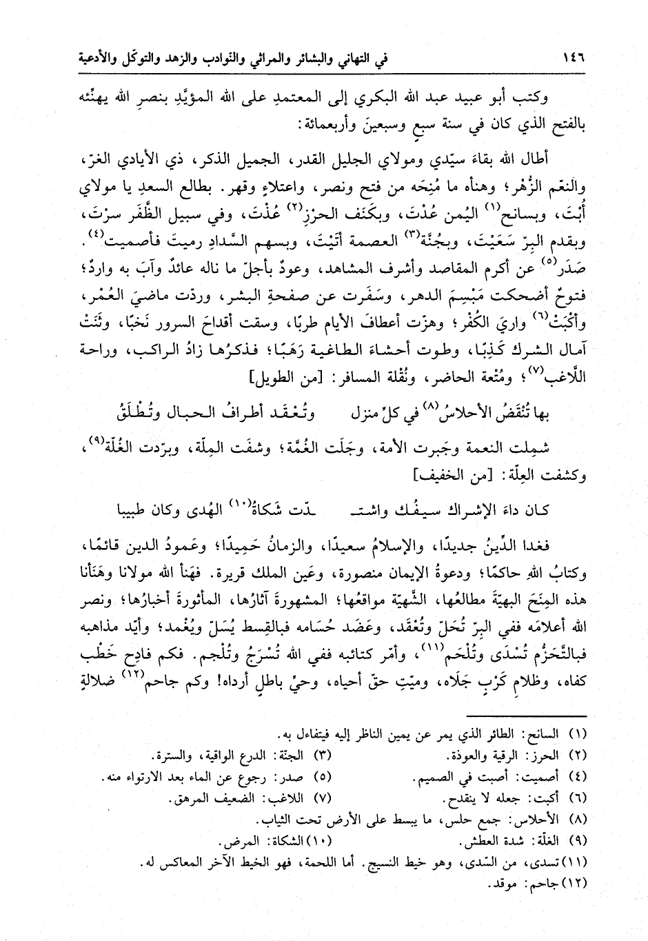 وكتب أبو عبيد عبد الله البكري إلى المعتمد على الله المؤيد بنصر الله يهنئه بالفتح الذي كان في سنة سبعٍ وسبعين وأربعمائة : أطال الله بقاء سيدي ومولاي الجليل القدر ، الجميل الذكر ، ذي الأيادي الغر ، والنعم الزهر ، وهنأه ما منحه من فتحٍ ونصر ، واعتلاءٍ وقهر . بطالع السعد يا مولاي أبت ، وبسانح اليمن عدت ، وبكنف الحرز عذت ، وفي سبيل الظفر سرت ، وبقدم البر سعيت ، وبجنة العصمة أتيت ، وبسهم السداد رميت فأصميت . صدرٌ عن أكرم المقاصد وأشرف المشاهد ، وعودٌ بأجل ما ناله عائدٌ وآب به وارد ، فتوحٌ أضحكت مبسم الدهر ، وسفرت عن صفحة البشر ، وردت ماضي العمر ، وأكبت واري الكفر ، وهزت أعطاف الأيام طرباً ، وسقت أقداح السرور نخباً ، وثنت آمال الشرك كذبا ، وطوت أحشاء الطاغية رهباً ، فذكرها زاد الراكب ، وراحة اللاغب ، ومتعة الحاضر ، ونقلة المسافر .