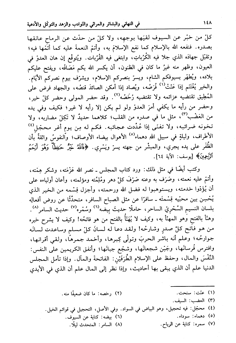 كل من خبر عن السيوف لقيها بوجهه ، ولا كل من حدث عن الرماح عانقها بصدره . فنفعه الله بالإسلام كما نفع الإسلام به ، وأتم النعمة عليه كما أتمها فيه ، وتقبل جهاده الذي جلا فيه الكربات ، وابتغى فيه القربات . ويتوقع إن هان العدو في العيون ، وظهر منه غير ما كان في الظنون ، أن يكسر الله بكم مصافه ، ويفتح عليكم بلاده ، ويطهر بسيوفكم الشام ، ويسر بنصركم الإسلام ، ويشرف بيوم نصركم الأيام . والخير يغتنم إذا عنت فرصه ، ويصاد إذا أمكن الصائد قنصه ، والجهاد فرضٌ على المطيق تقتضيه عزائمه ولا تقتضيه رخصه . وقد حضر المولى وحضر كل خير ، وحضر من رأيه ما يكفي أمر العدو ولو لم يكن إلا رأيه لا غير ، فكيف وفي يده من العضب ، مثل ما في صدره من القلب ، كلاهما حديدٌ لا تكل مضاربه ، ولا تخونه ضرائبه ، ولا تفنى إذا عددت عجائبه ، فكم له من يومٍ أغر محجل الأطراف ، وليلةٍ في سبيل الله دهماء الأهوال بيضاء الأوصاف ، والنفوس واثقةٌ بأن الظفر على يده يجري ، والمبشر من جهته يسر ويسري . والله خيرٌ حافظاً وهو أرحم الراحمين .